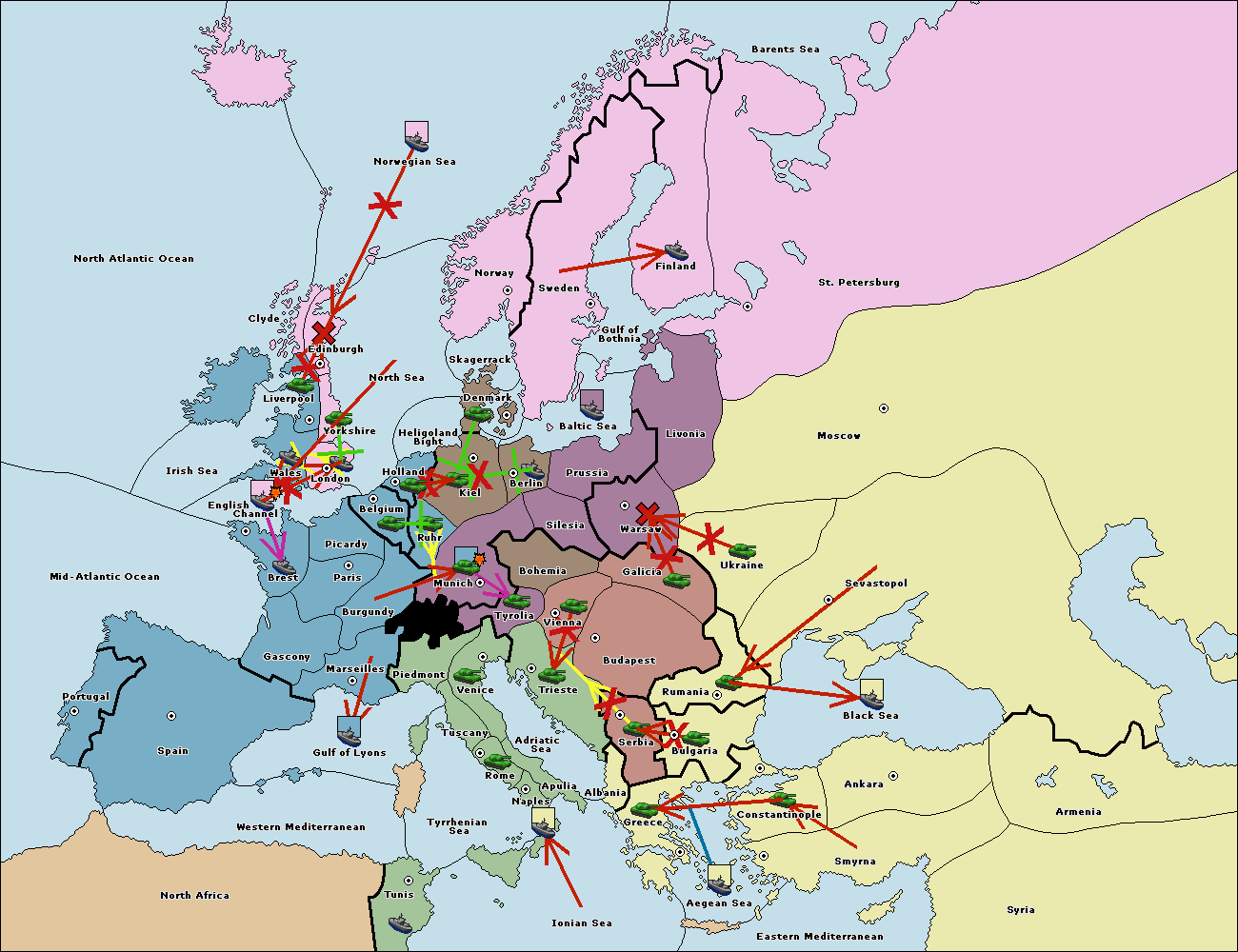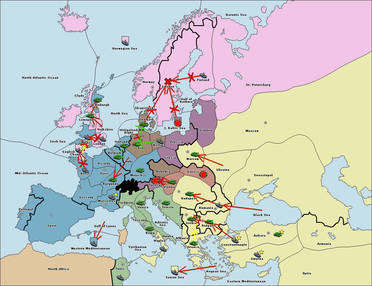 The fleet at Greece support move to Bulgaria from Constantinople.