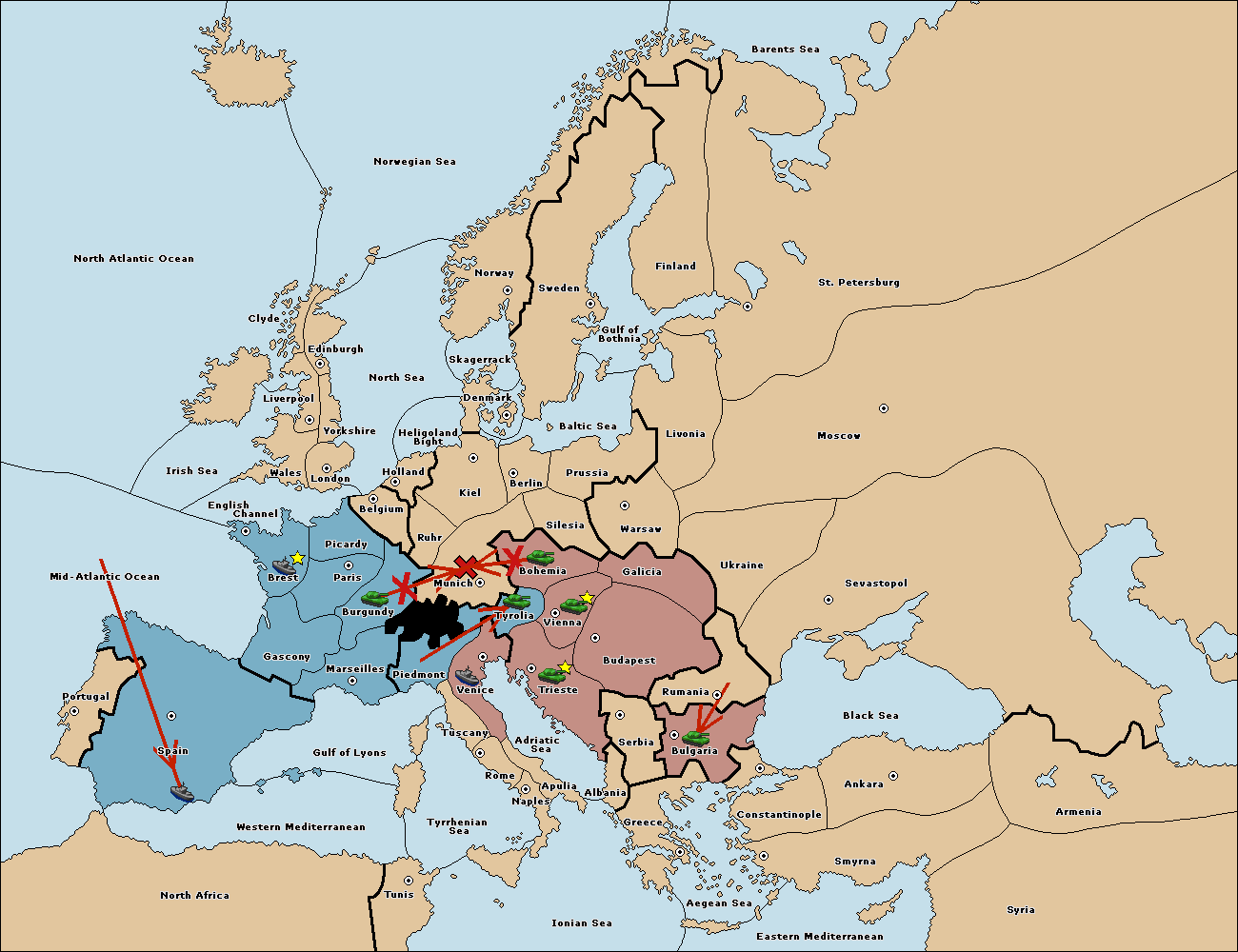 The army at Tyrolia support move to Piedmont from Marseilles.