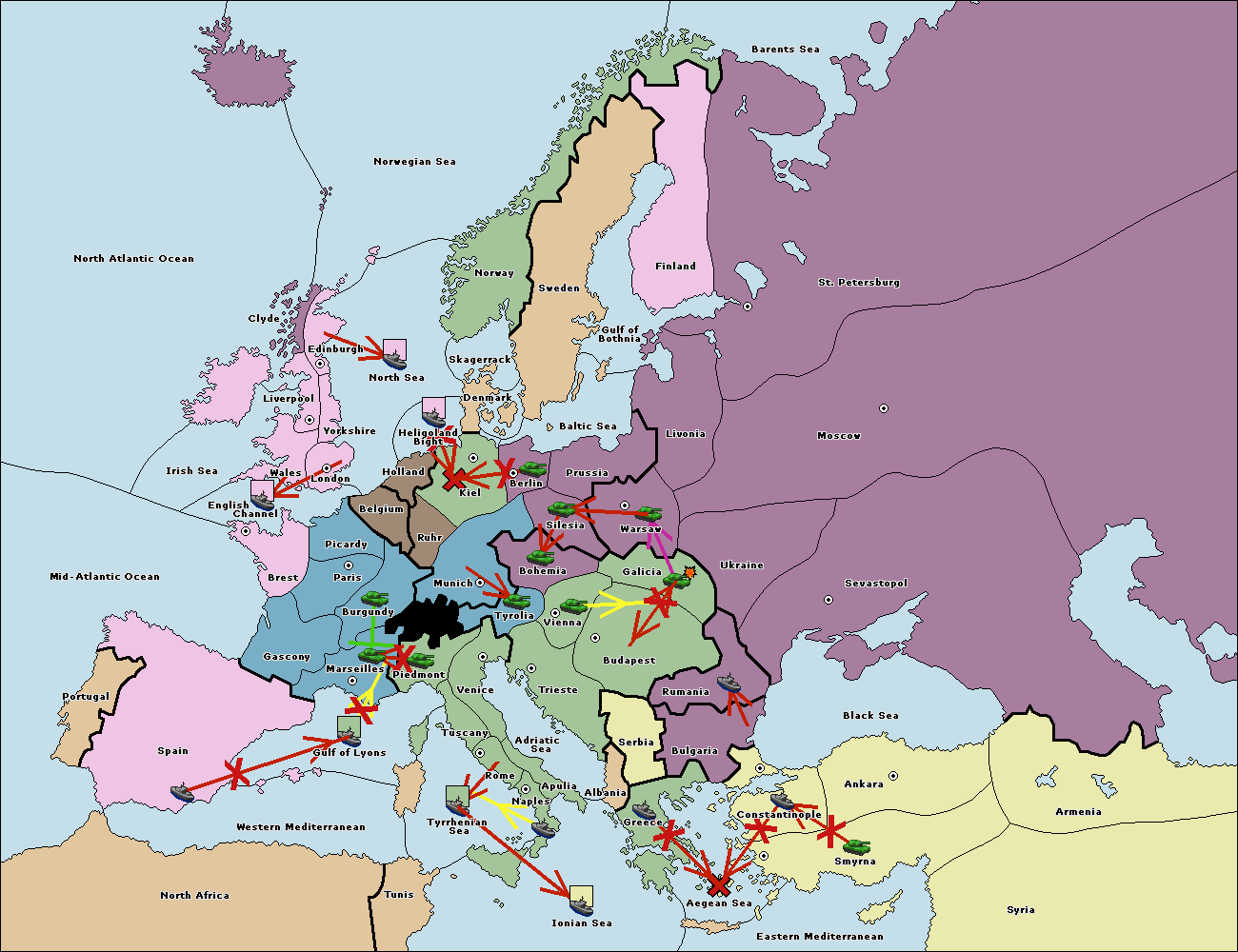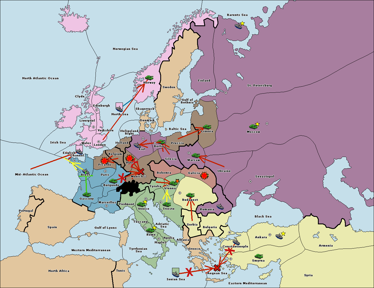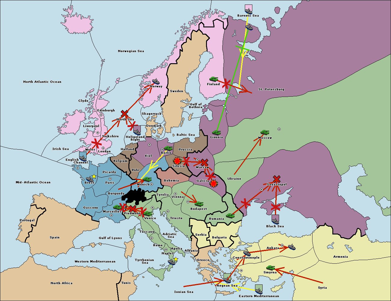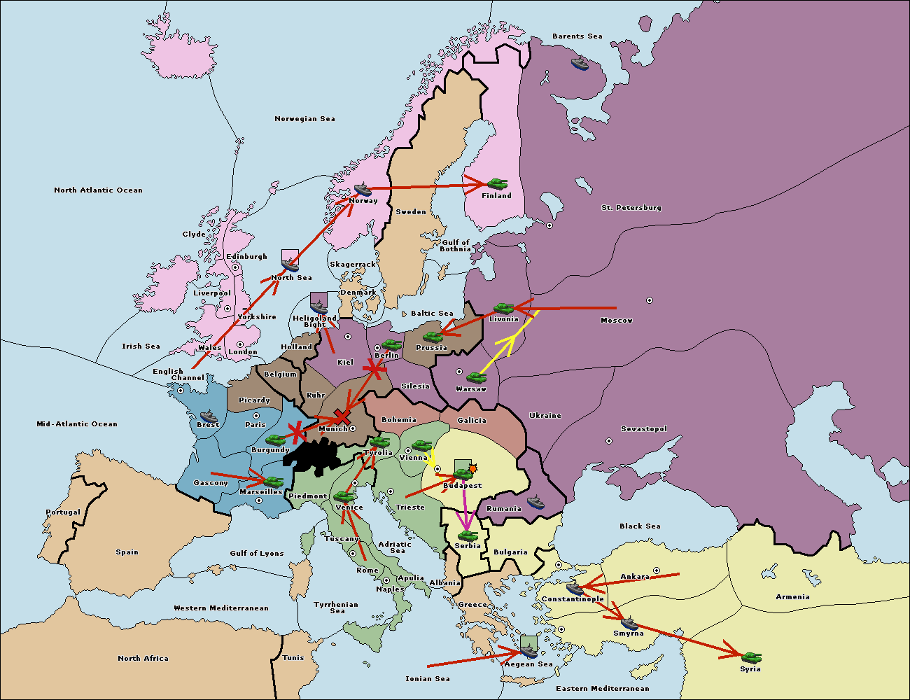 The fleet at Rumania support move to Bulgaria from Constantinople.