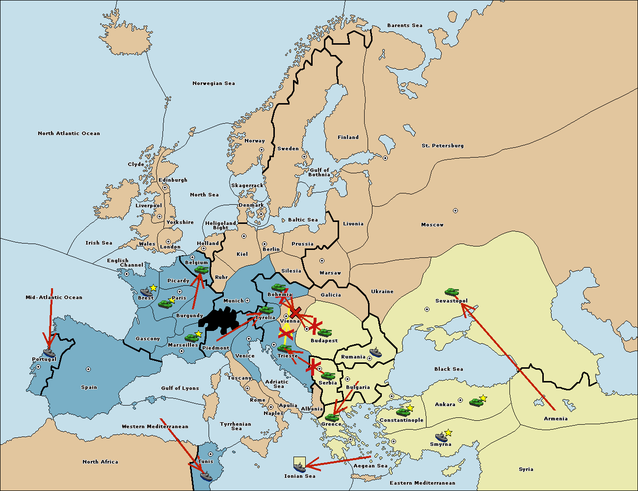 The fleet at Bulgaria (South Coast) move to Constantinople.