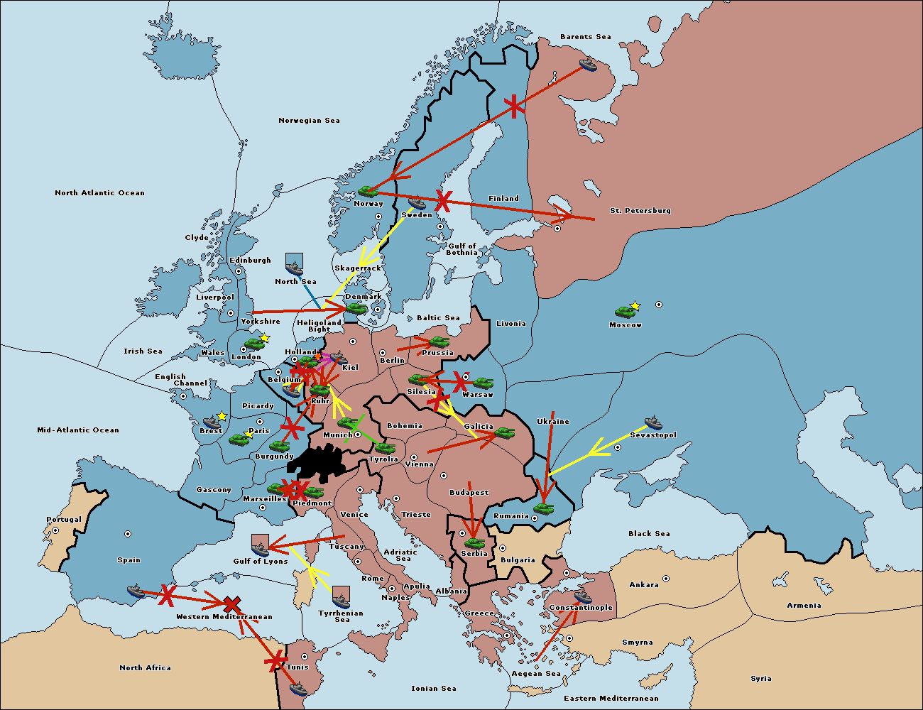 The fleet at Tyrrhenian Sea support move to Gulf of Lyons from Tuscany.