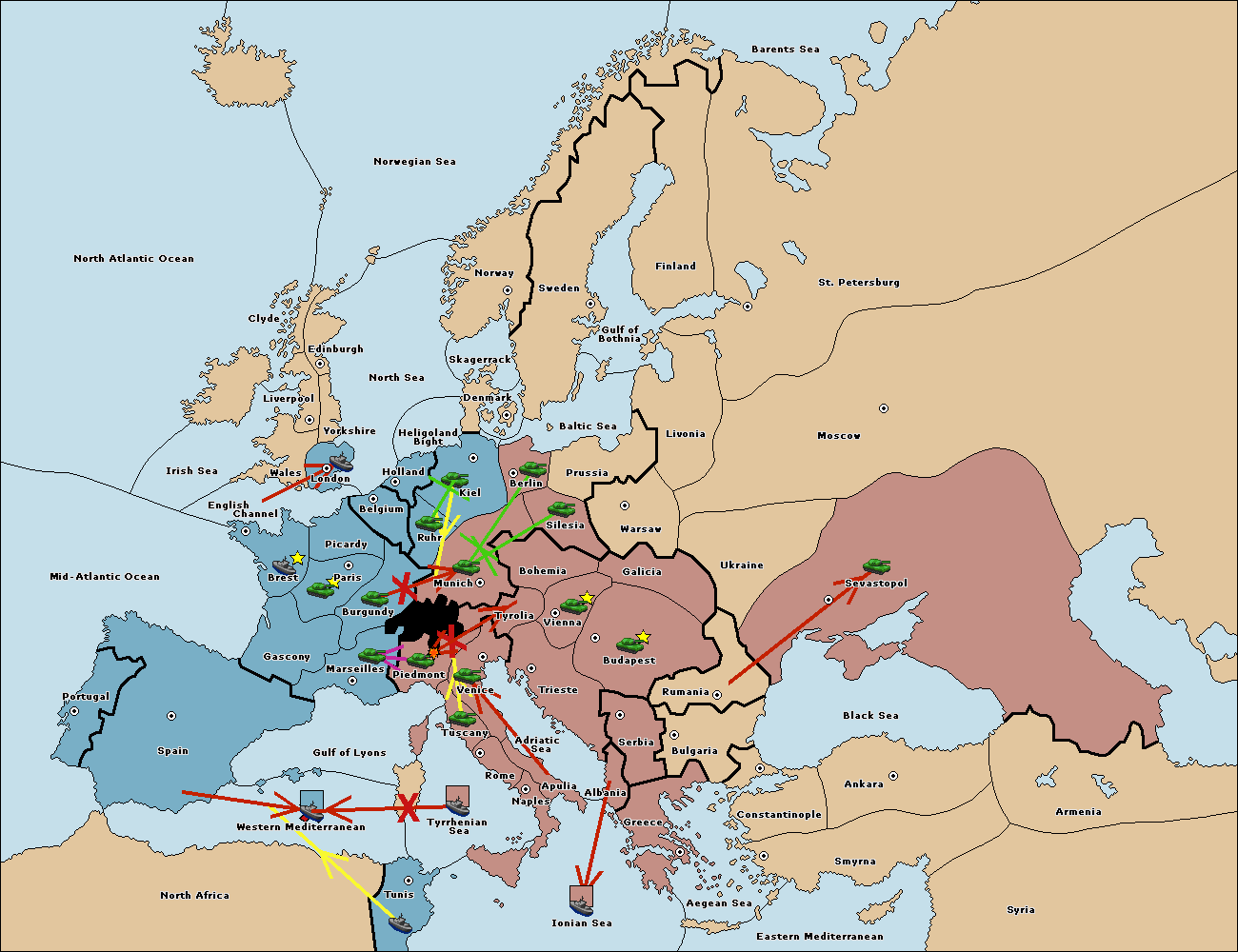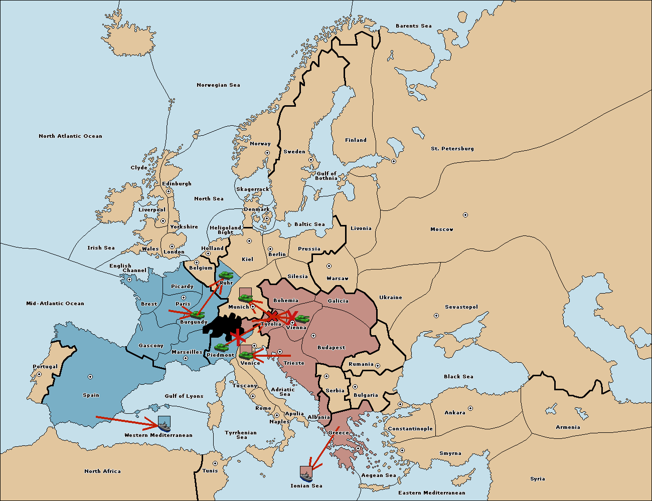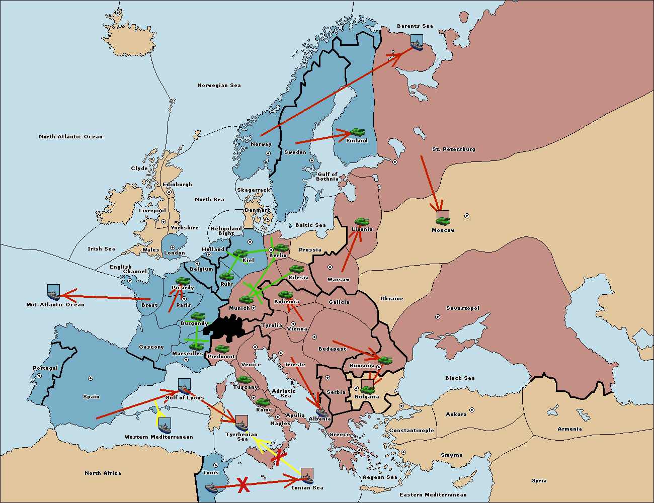 The fleet at Ionian Sea support move to Tyrrhenian Sea from Gulf of Lyons.