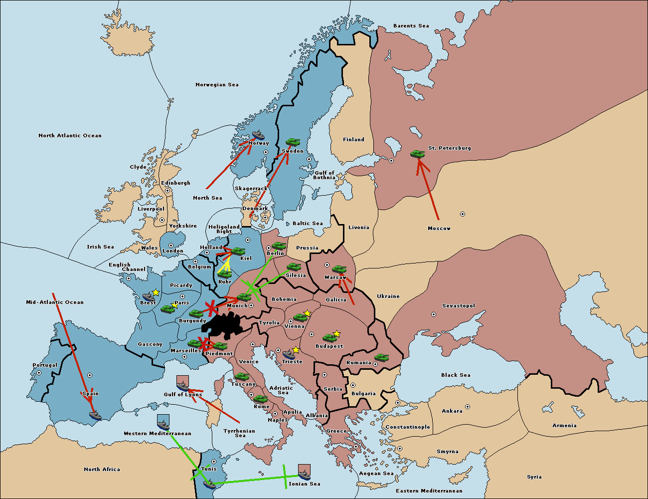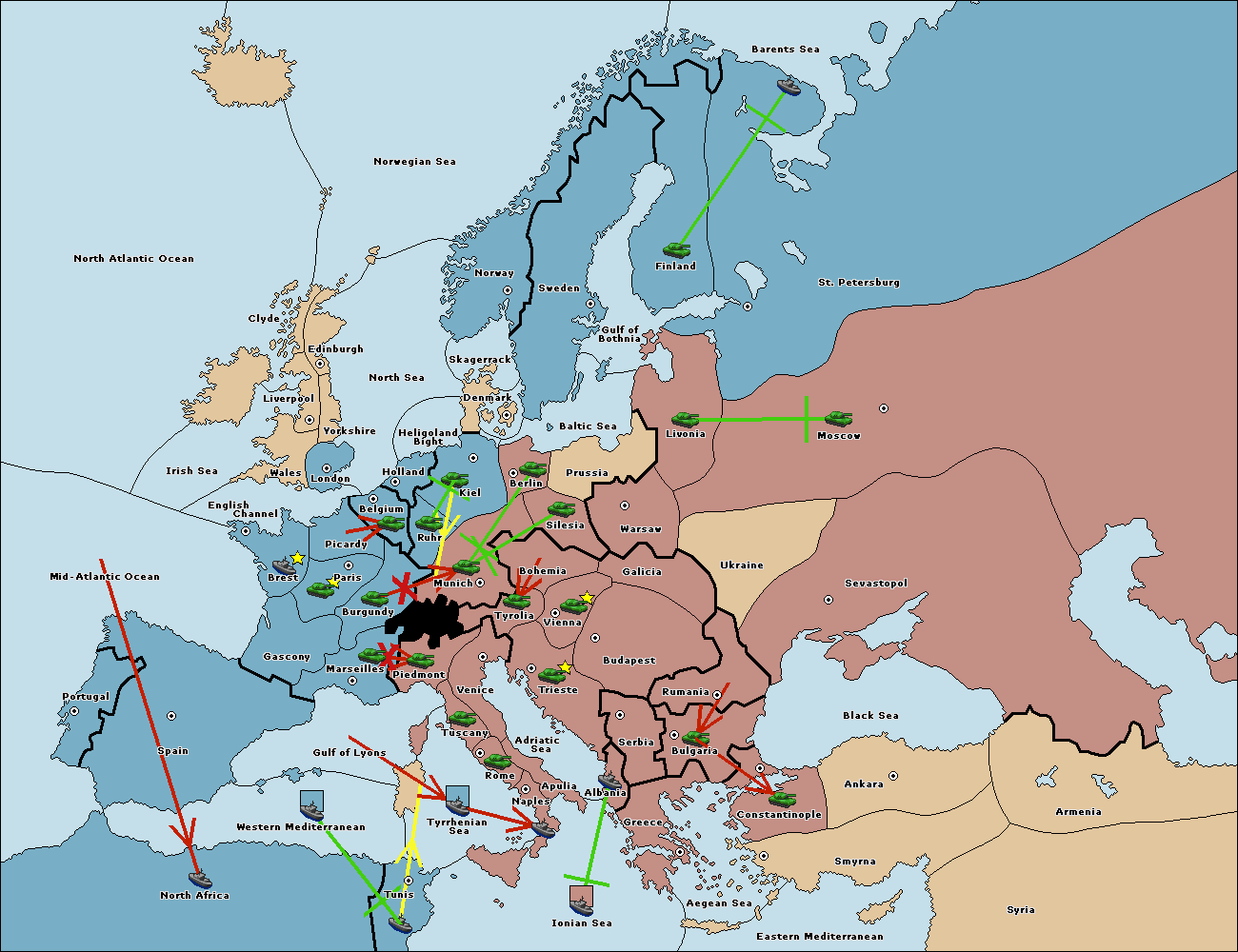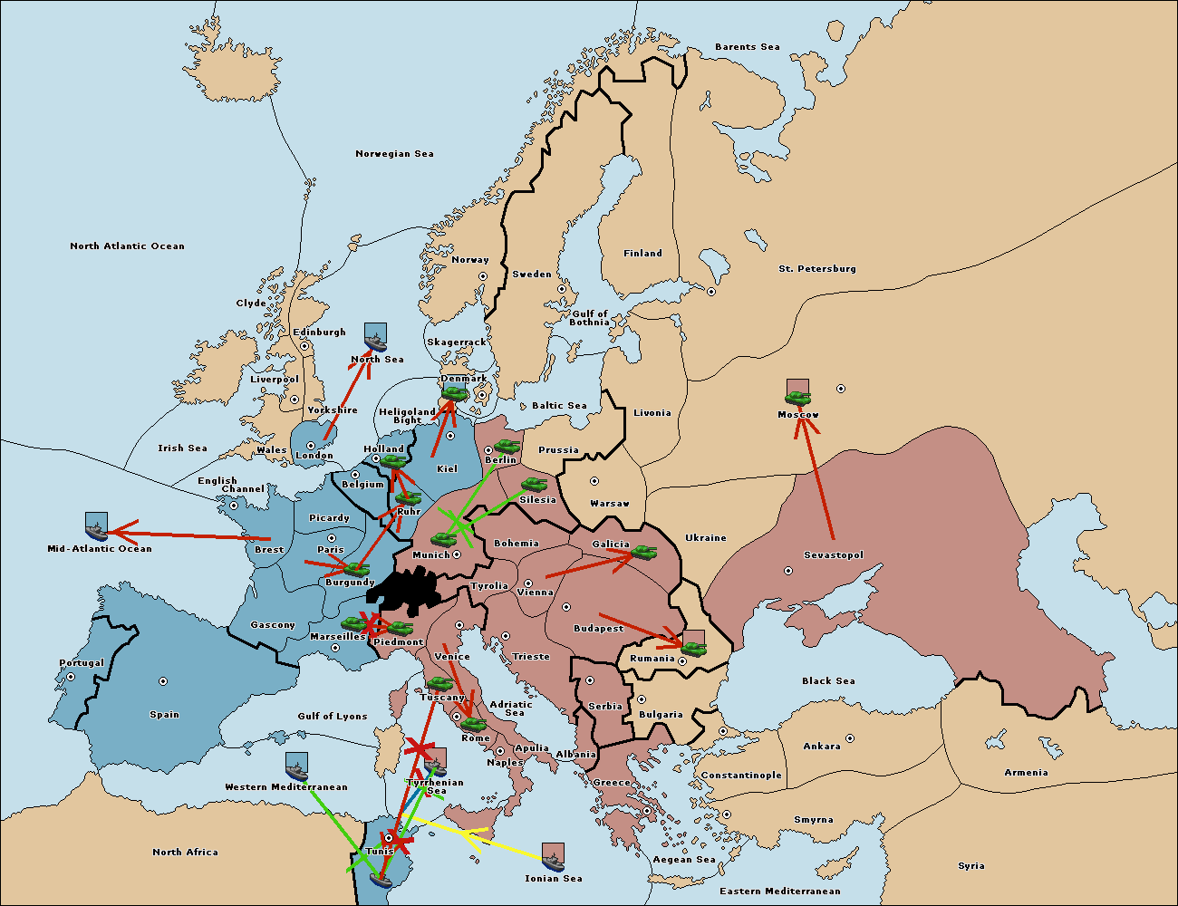 The fleet at Ionian Sea support move to Tyrrhenian Sea from Gulf of Lyons.