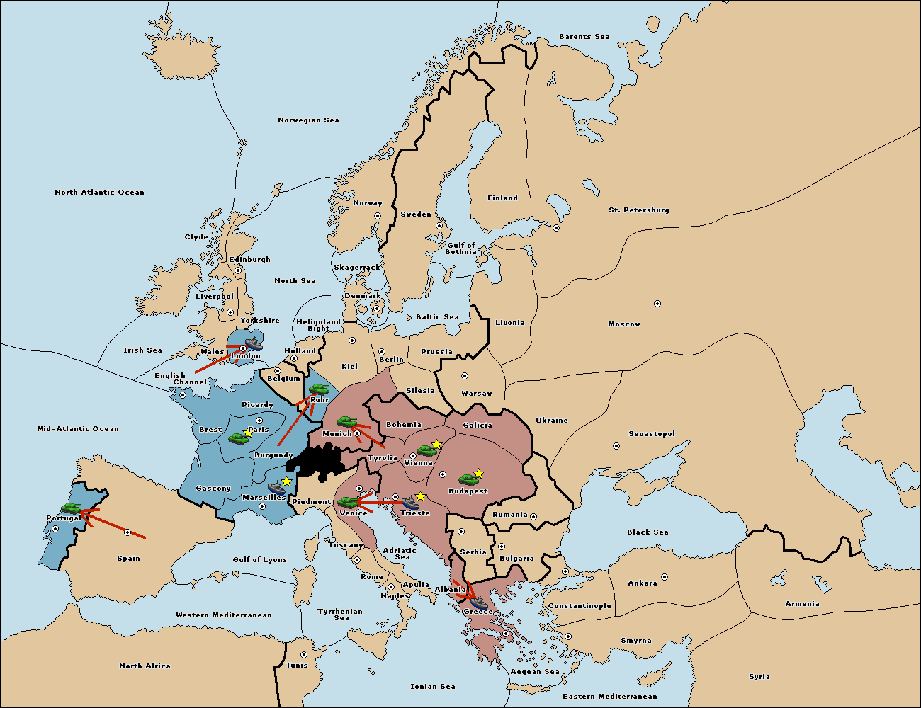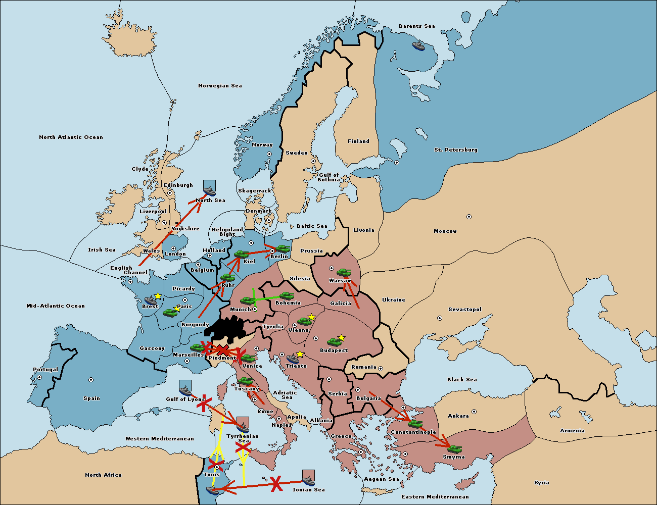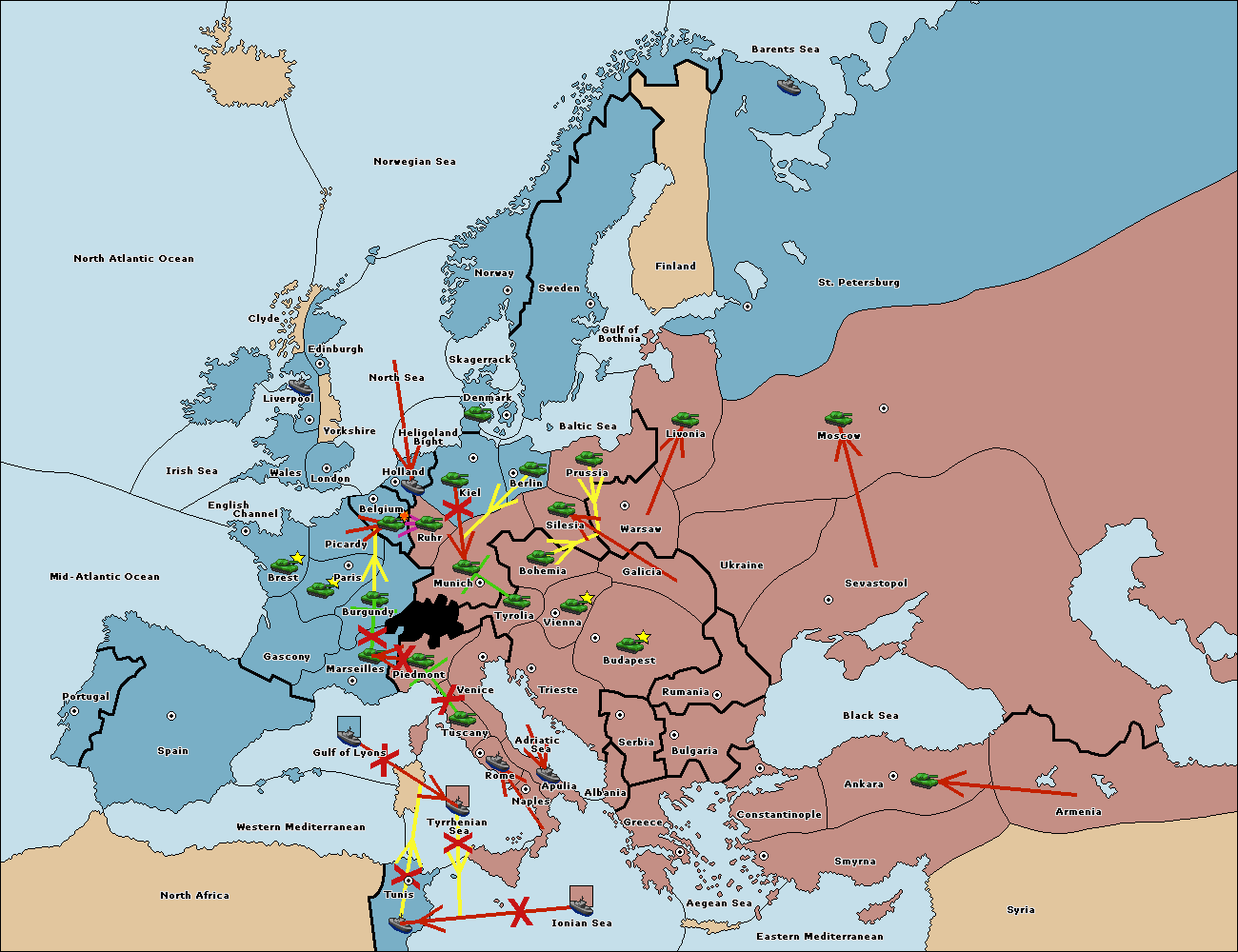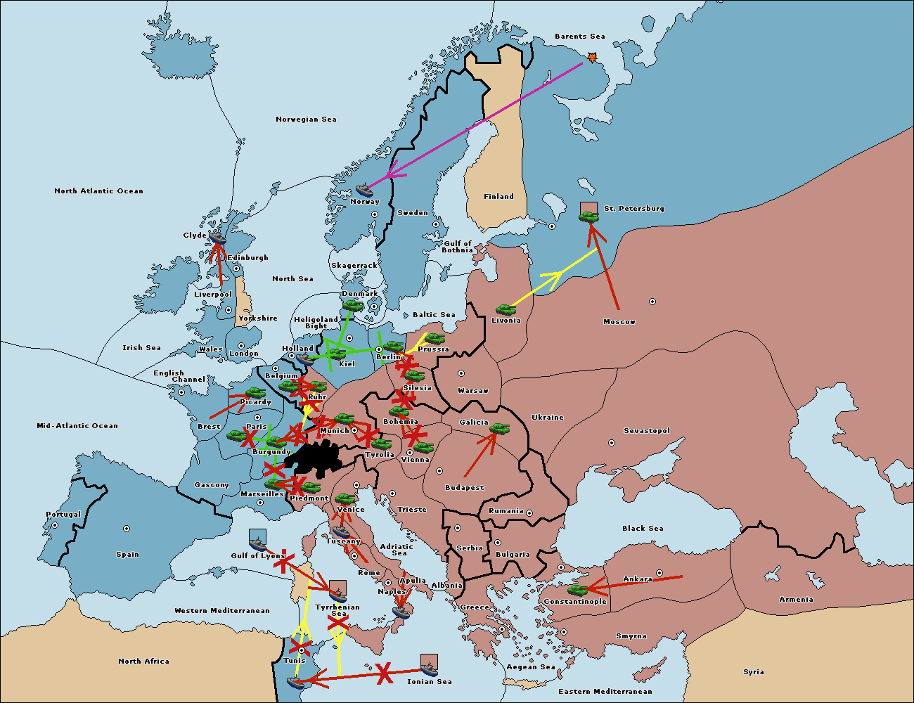 The fleet at Tyrrhenian Sea support move to Gulf of Lyons from Tuscany.