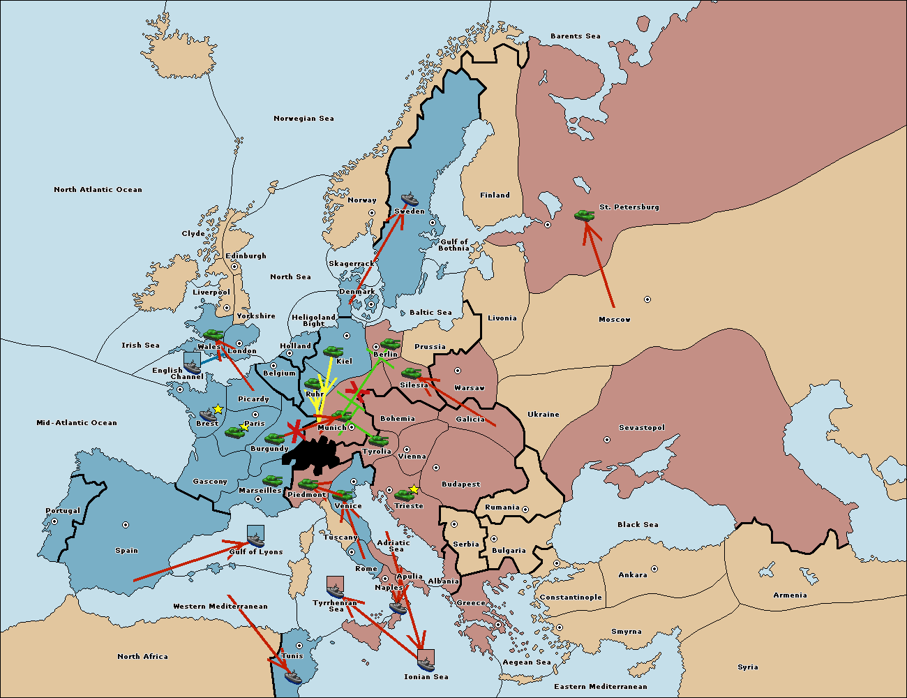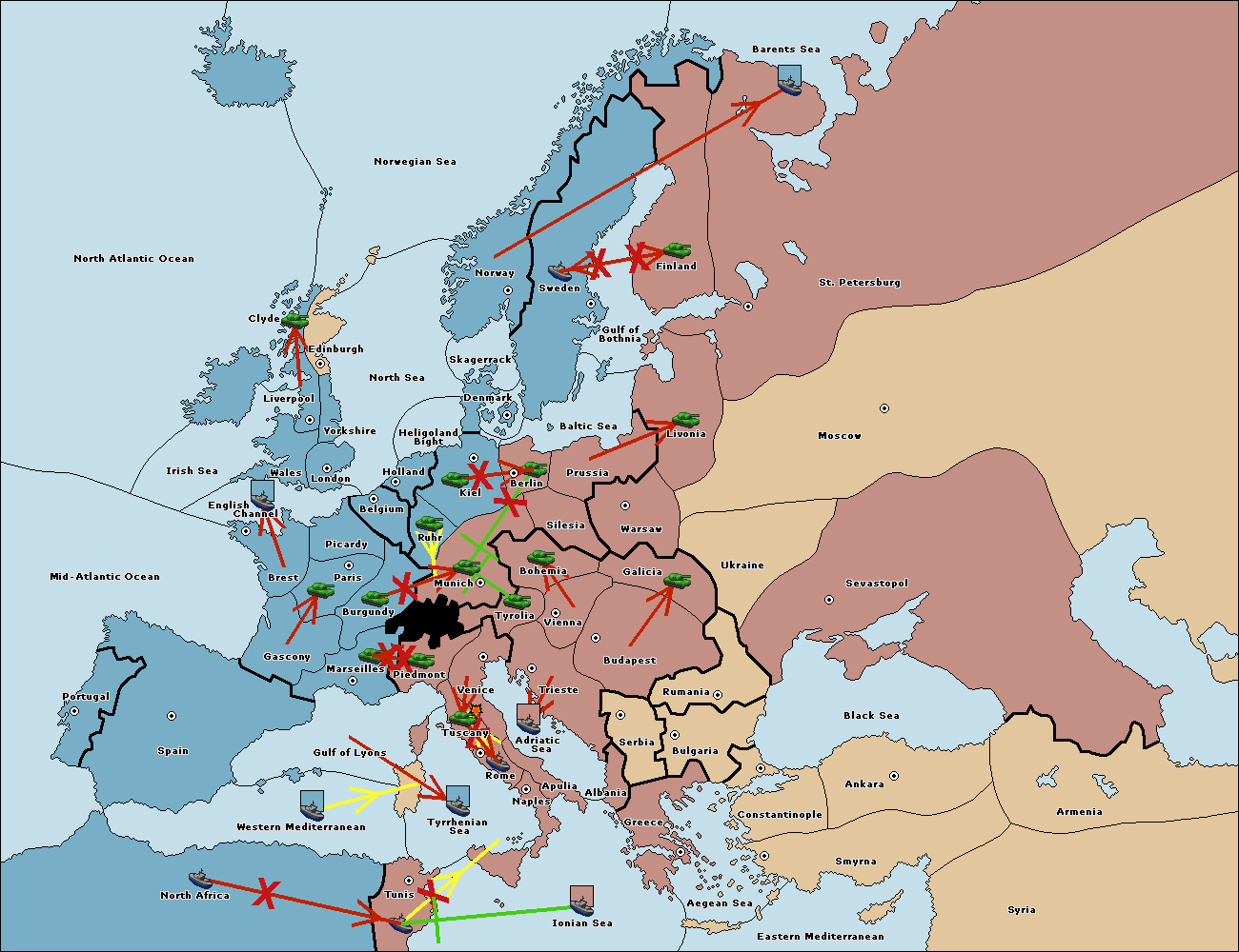 The fleet at Tyrrhenian Sea support move to Tunis from Ionian Sea.