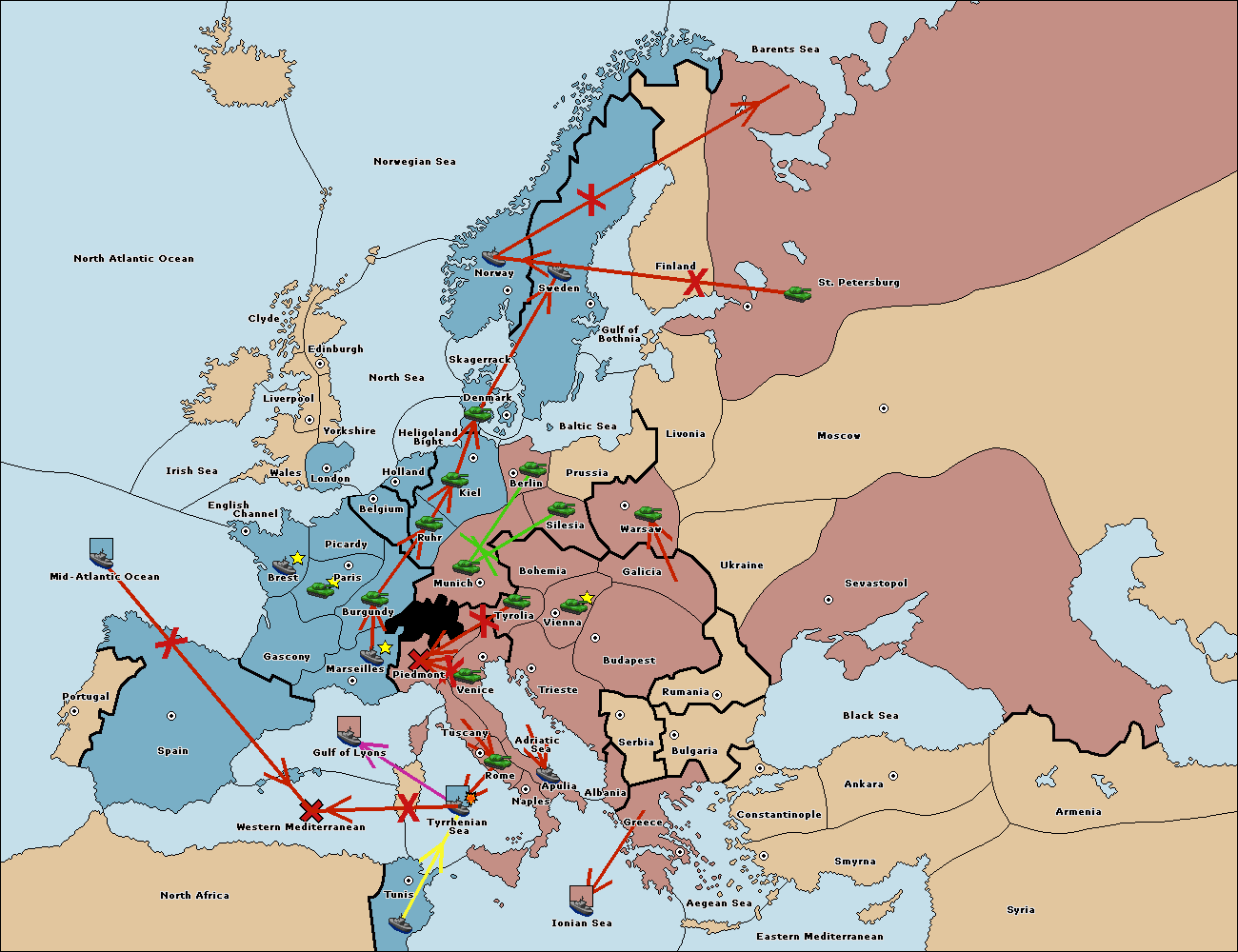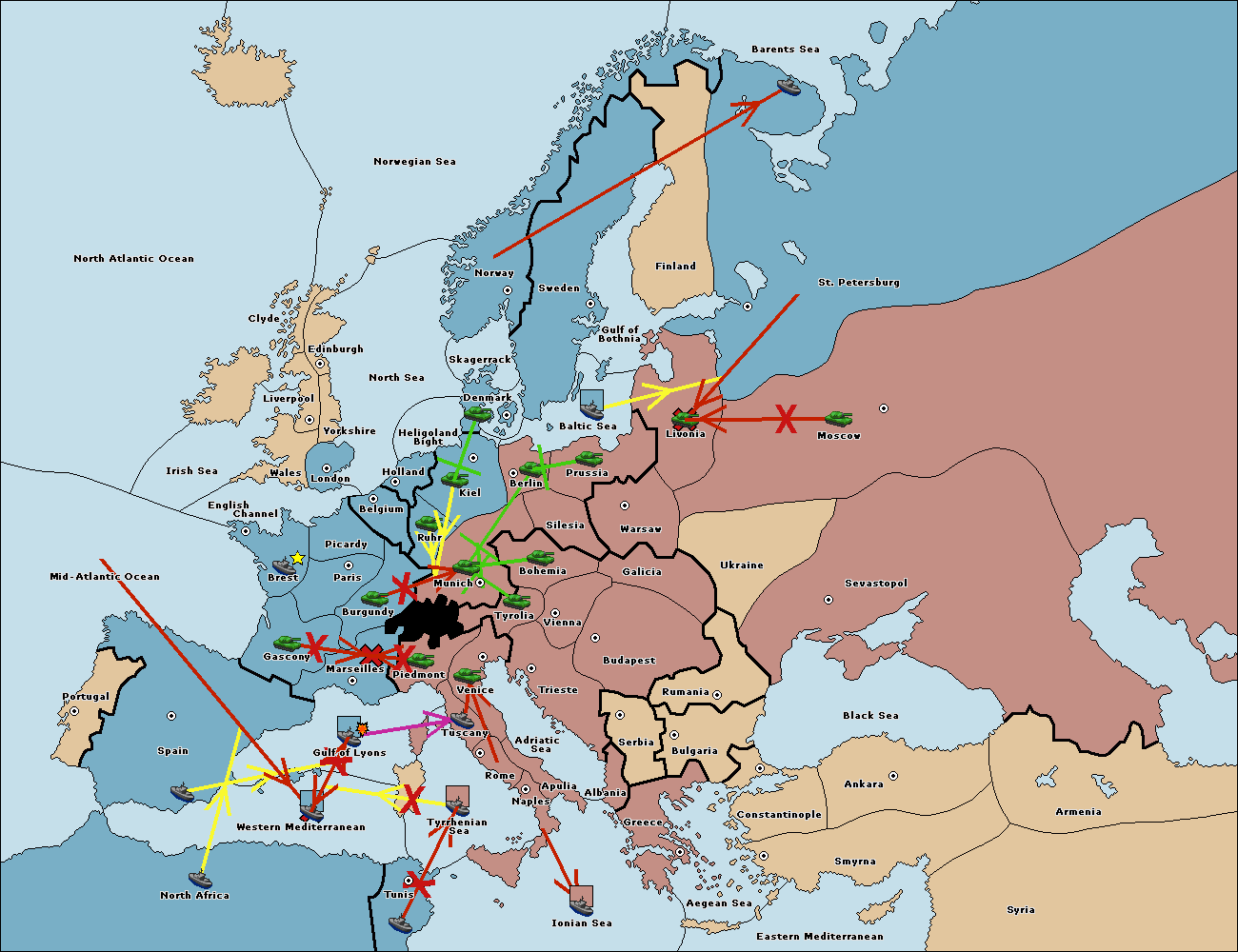 The fleet at Gulf of Lyons move to Tyrrhenian Sea.