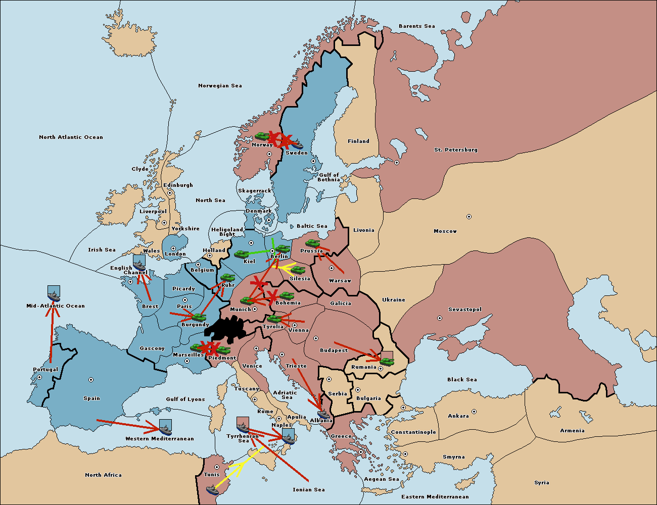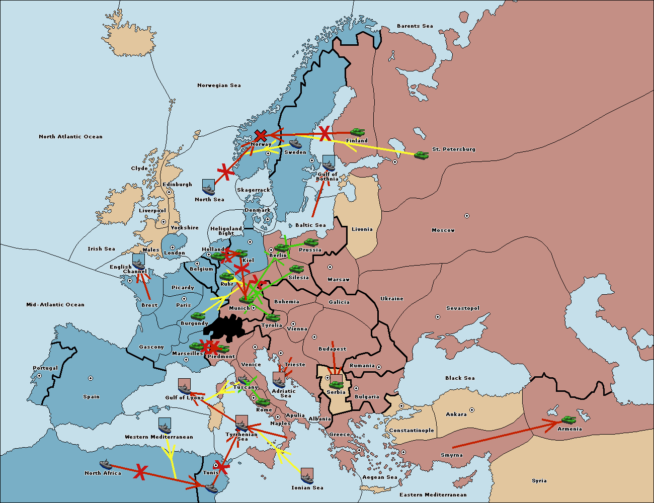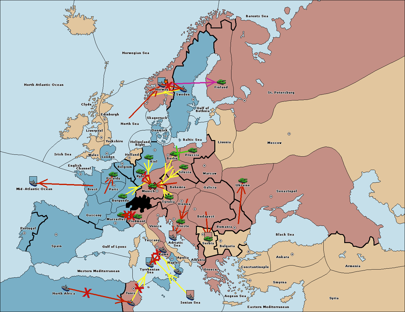 The fleet at Tyrrhenian Sea support move to Tunis from Ionian Sea.