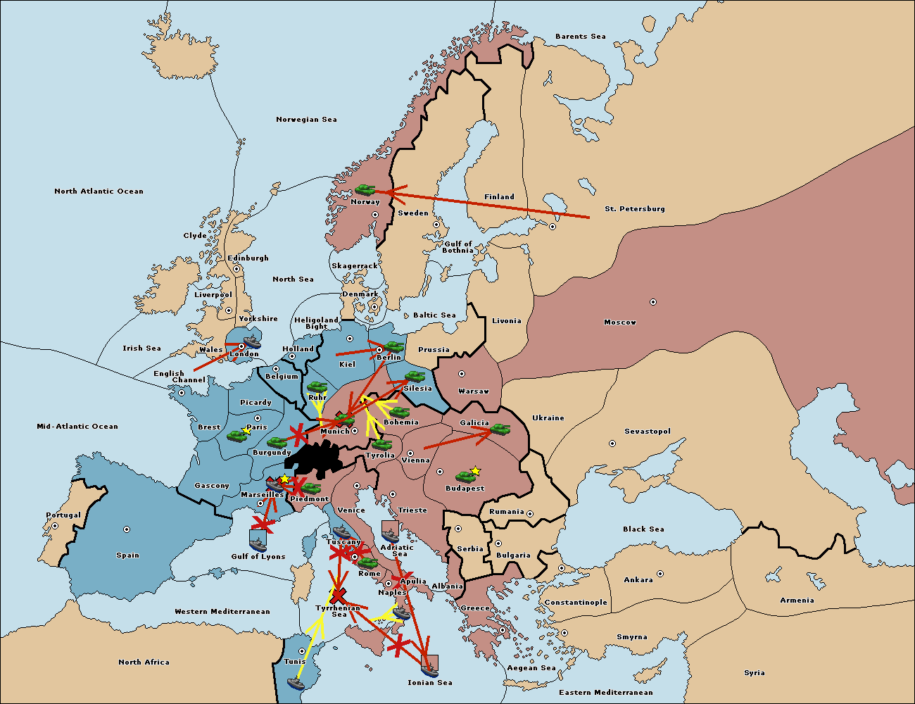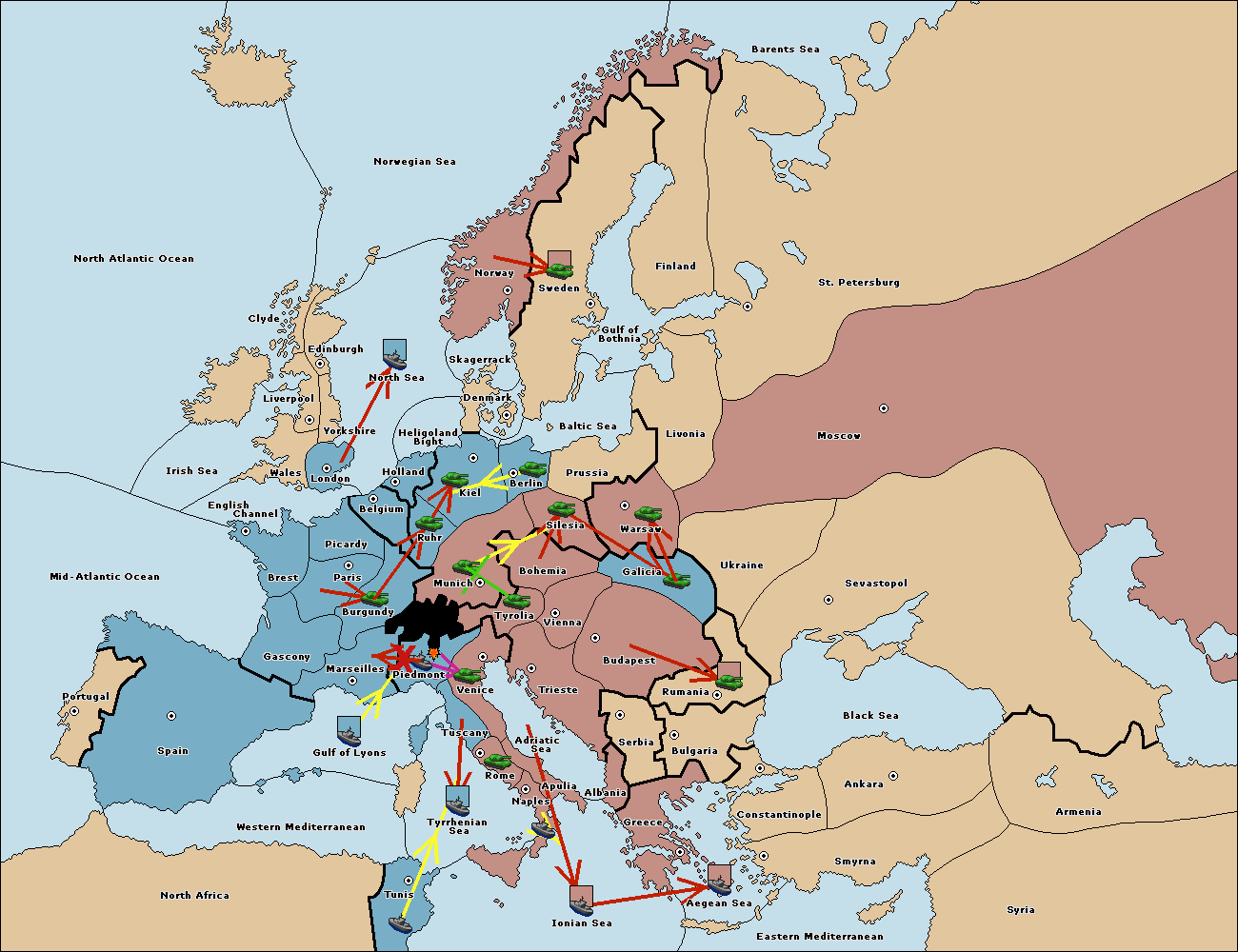 The fleet at Gulf of Lyons support move to Tuscany from Piedmont.