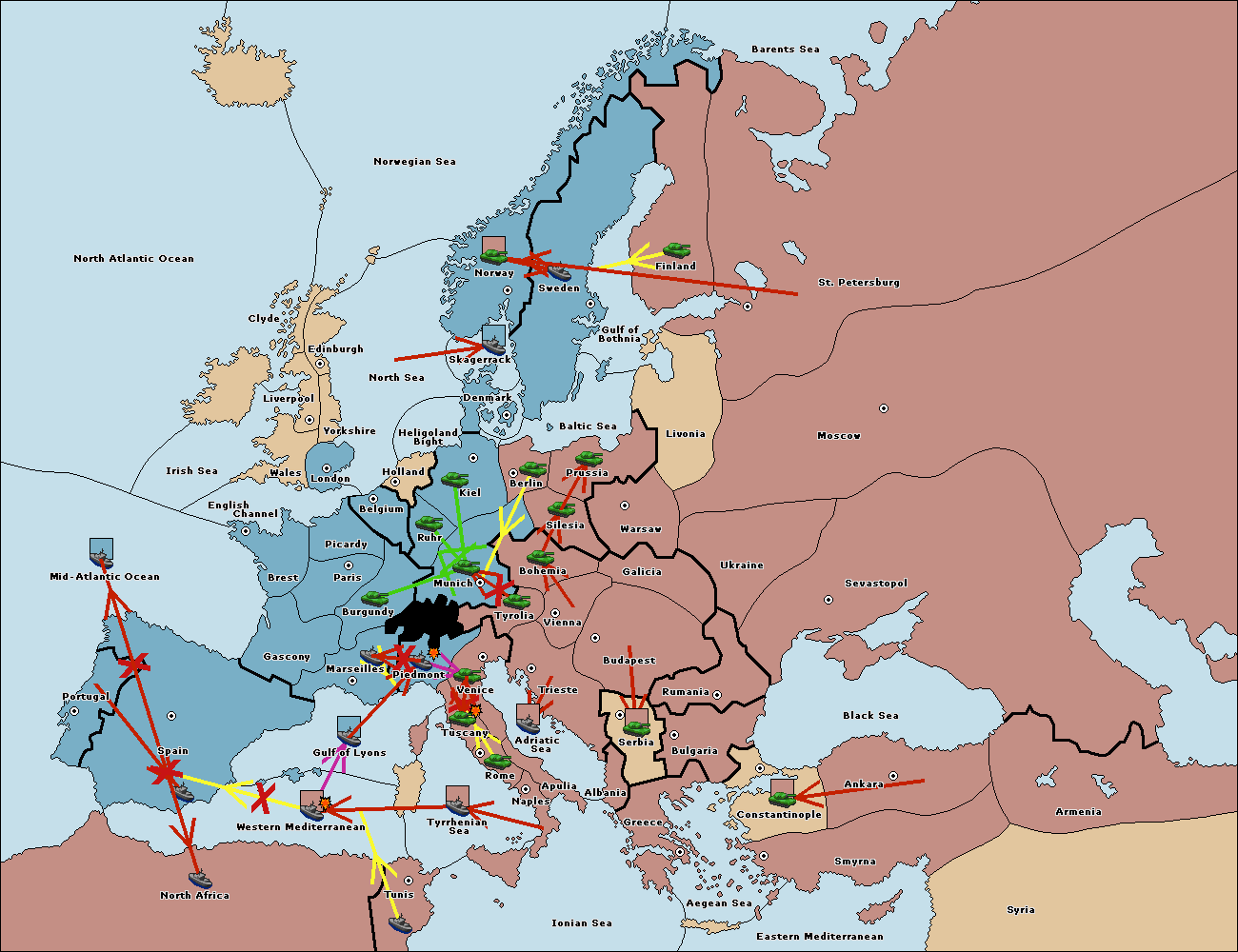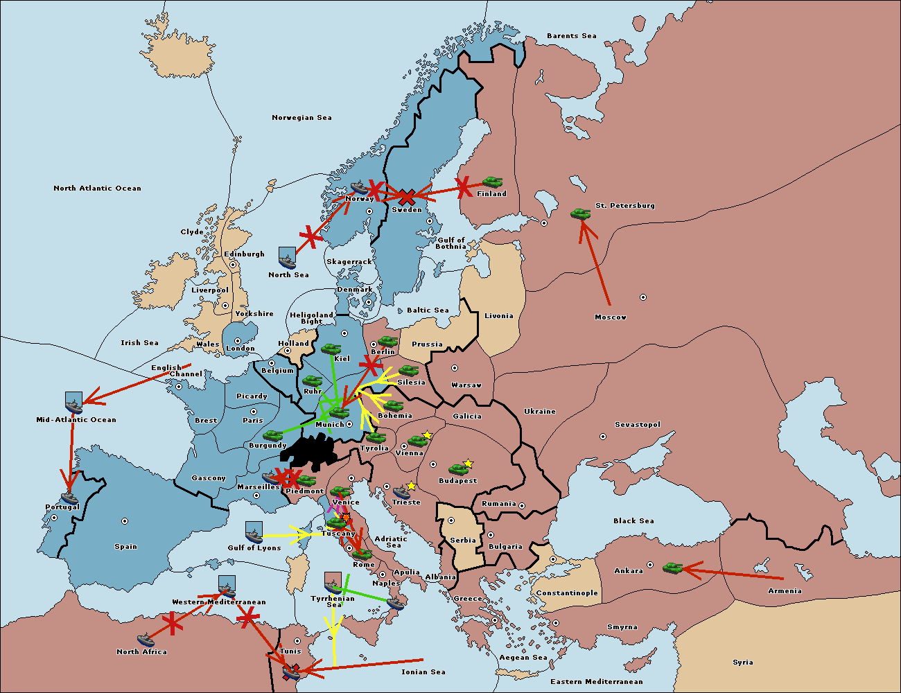 The fleet at Tyrrhenian Sea support move to Tunis from Ionian Sea.
