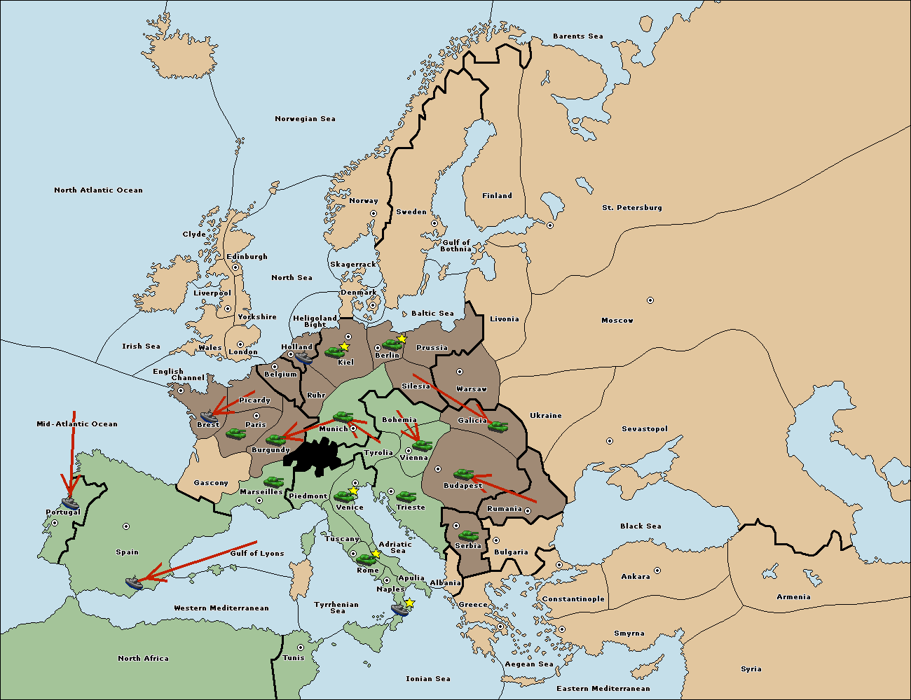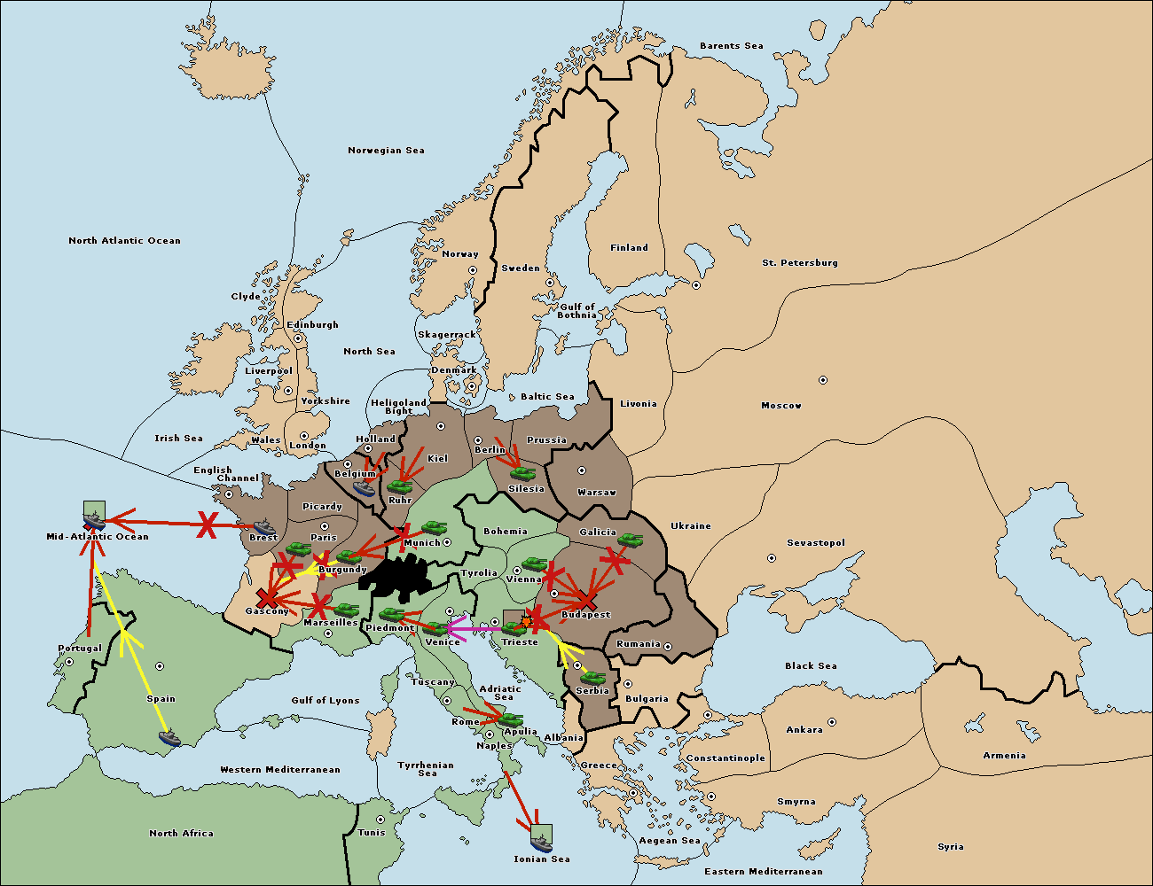 The fleet at North Africa move to Mid-Atlantic Ocean.