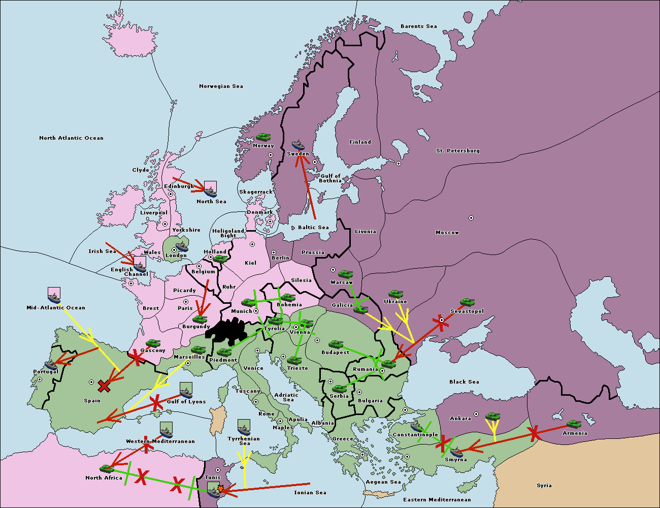 The fleet at Tyrrhenian Sea support move to Tunis from Ionian Sea.