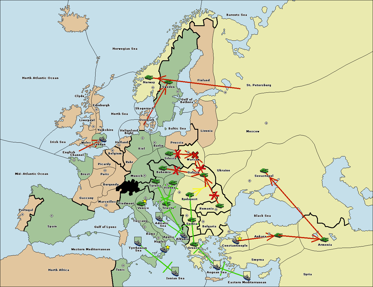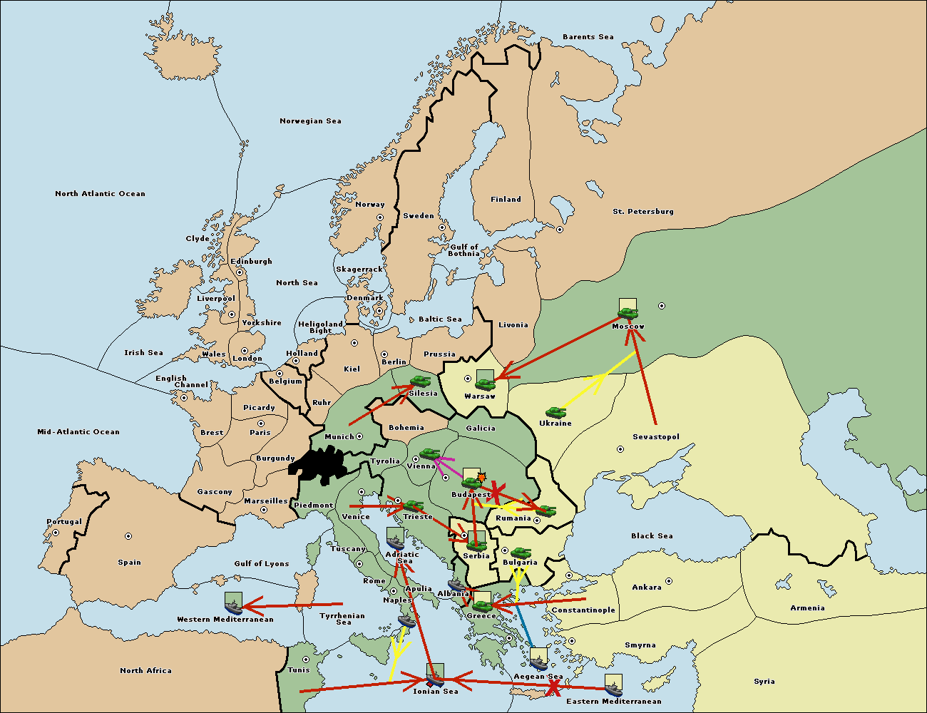 The fleet at Bulgaria (South Coast) support move to Greece from Constantinople.