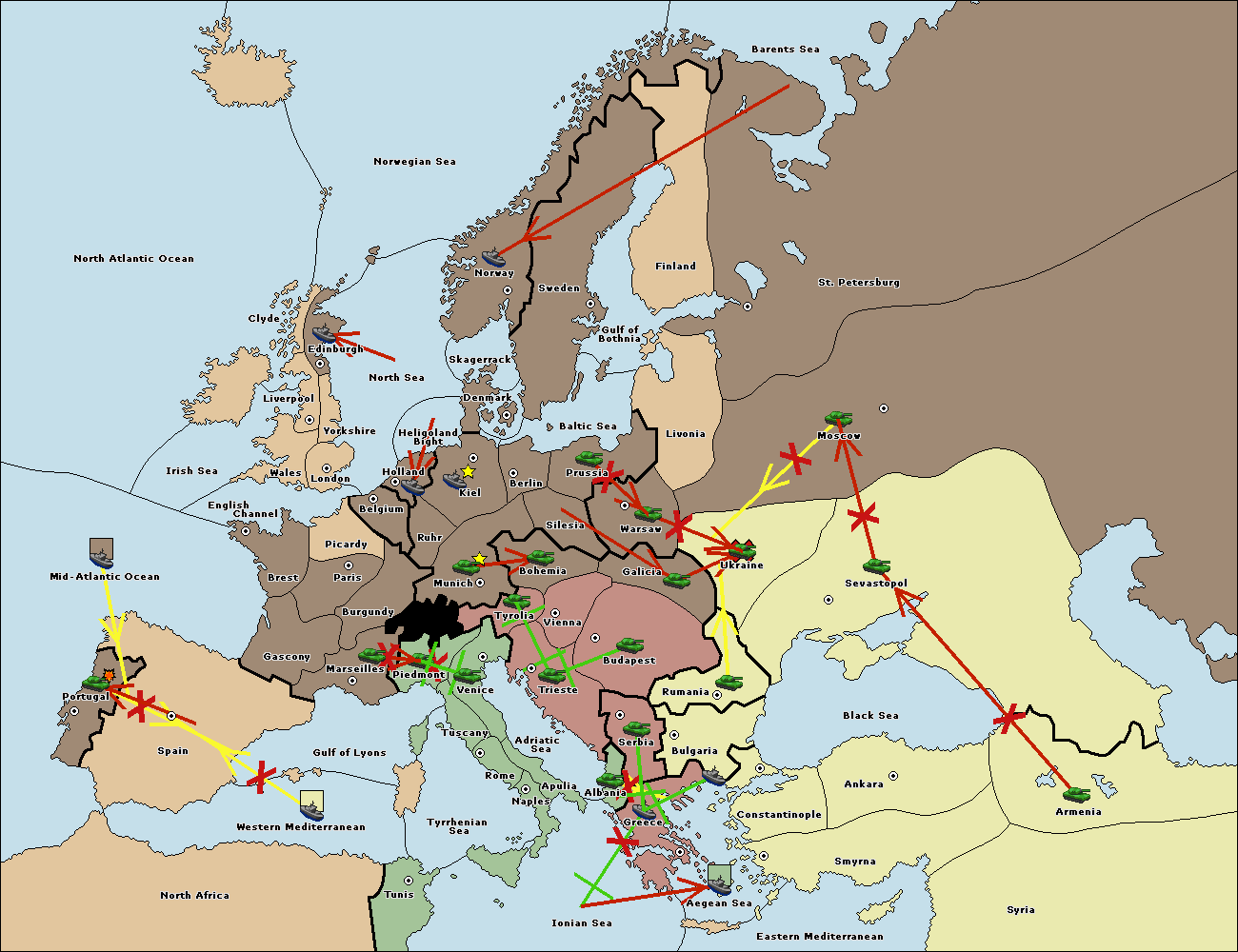 The army at Tyrolia support move to Piedmont from Marseilles.