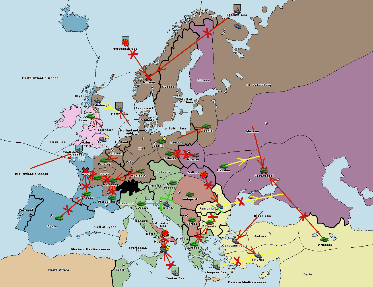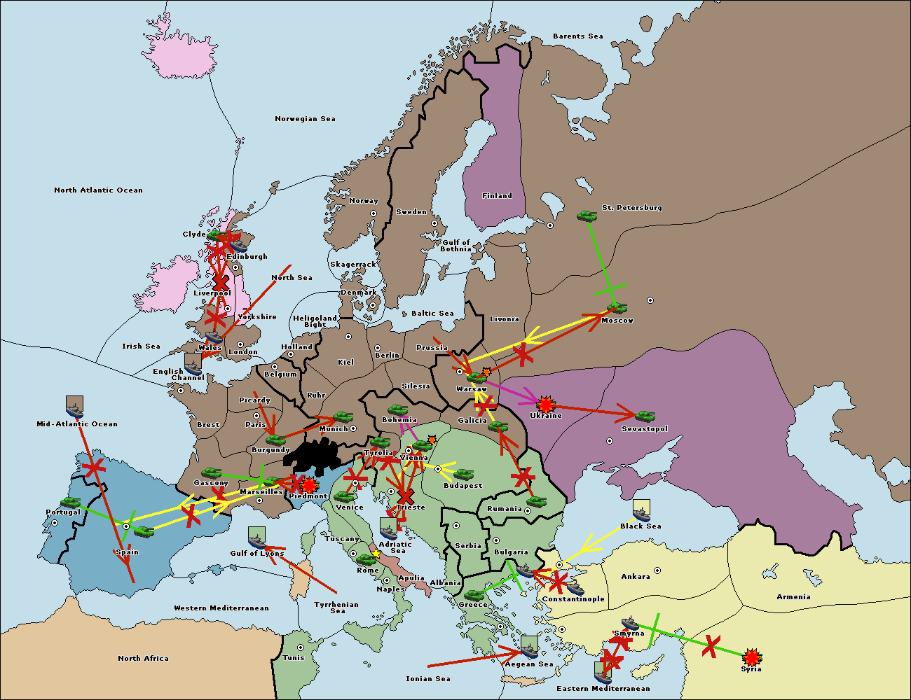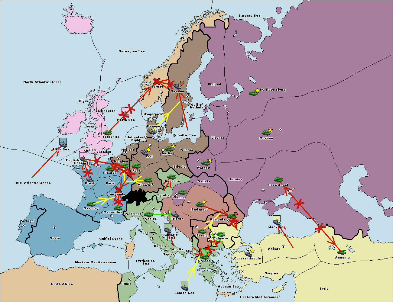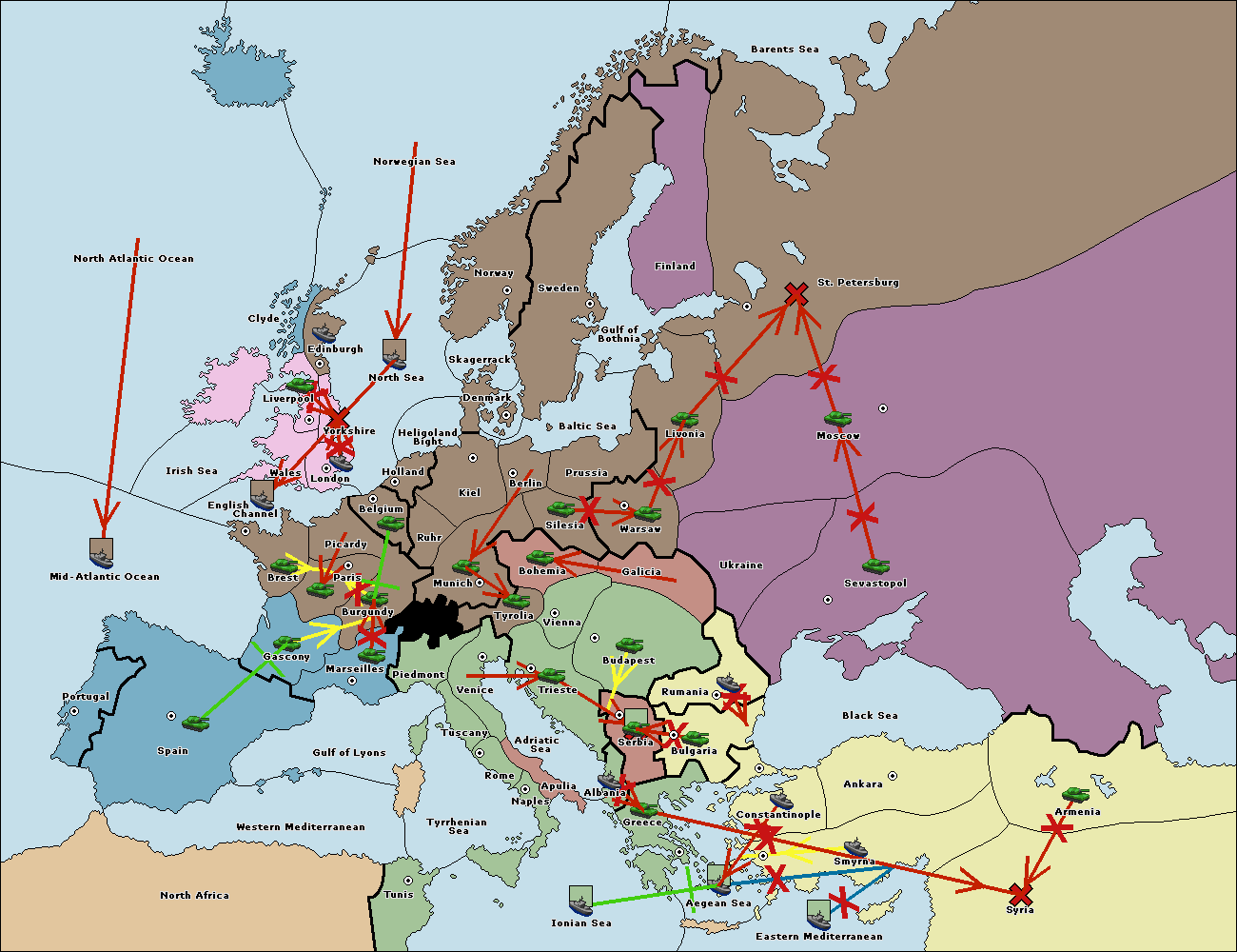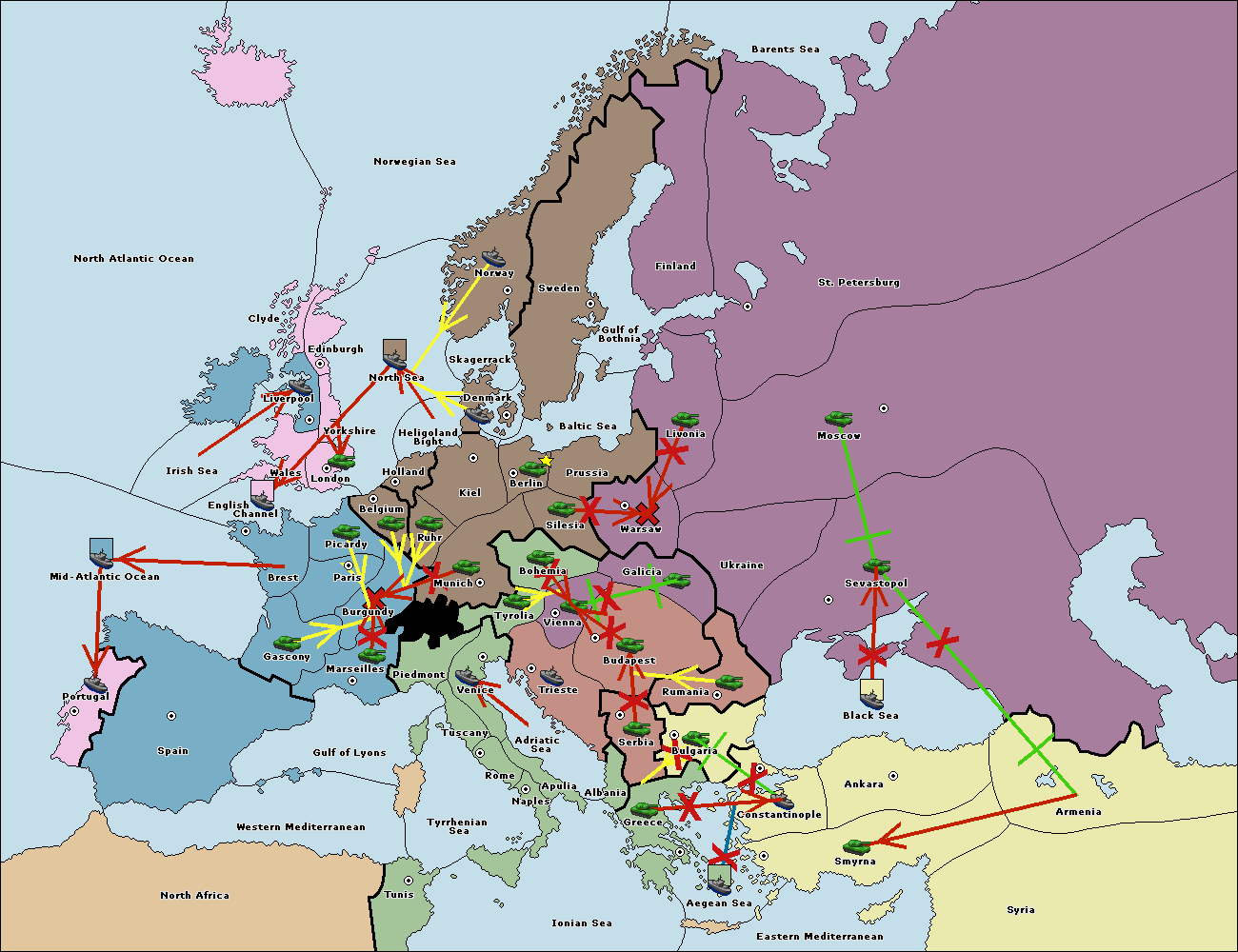 The fleet at Bulgaria (South Coast) support move to Constantinople from Aegean Sea.