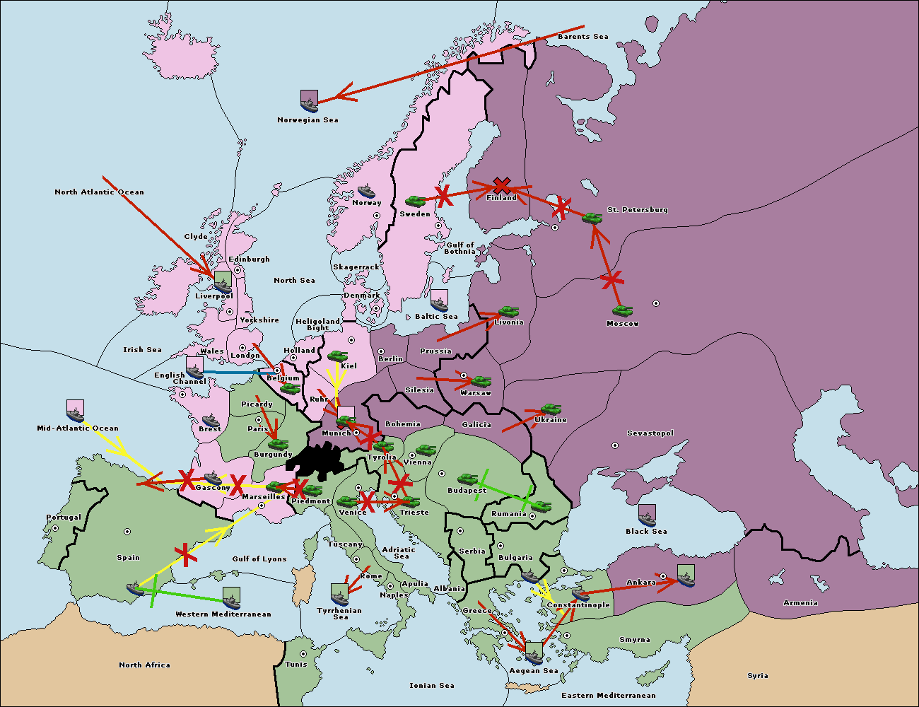 The fleet at Bulgaria (South Coast) support move to Constantinople from Aegean Sea.