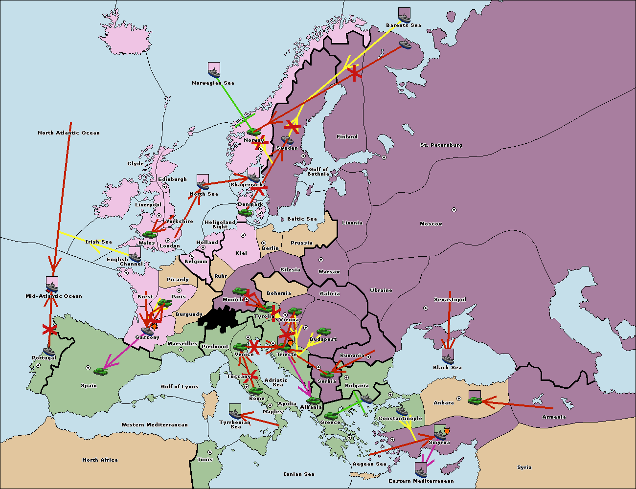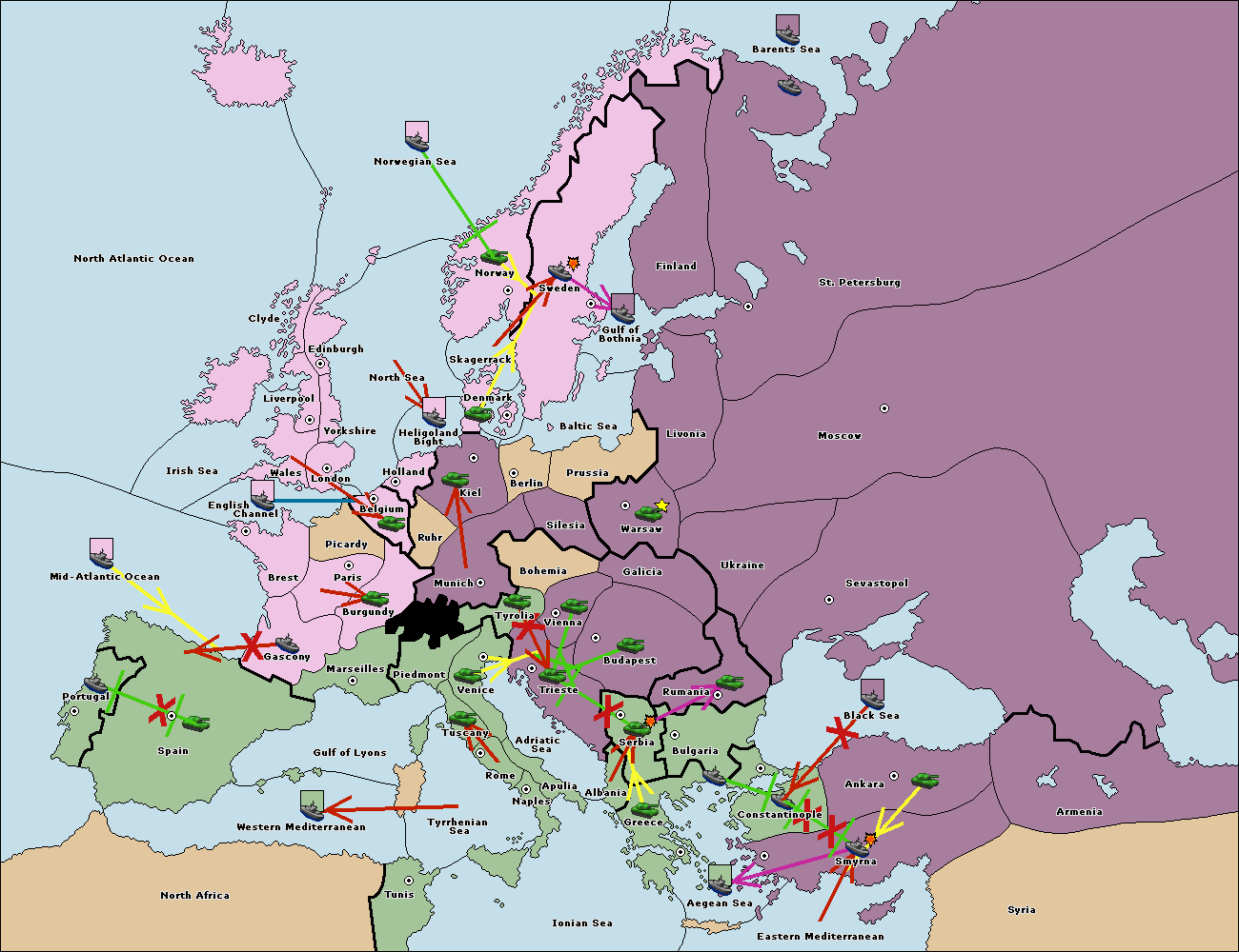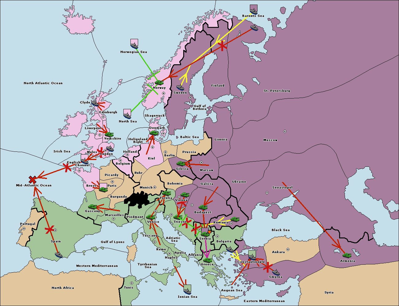 The fleet at Bulgaria (South Coast) support move to Constantinople from Aegean Sea.