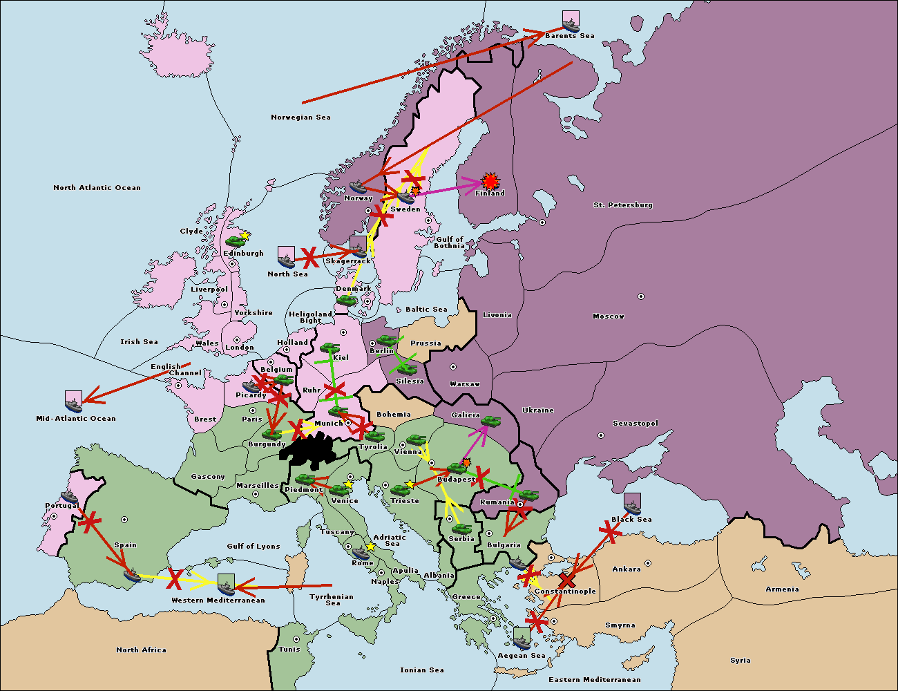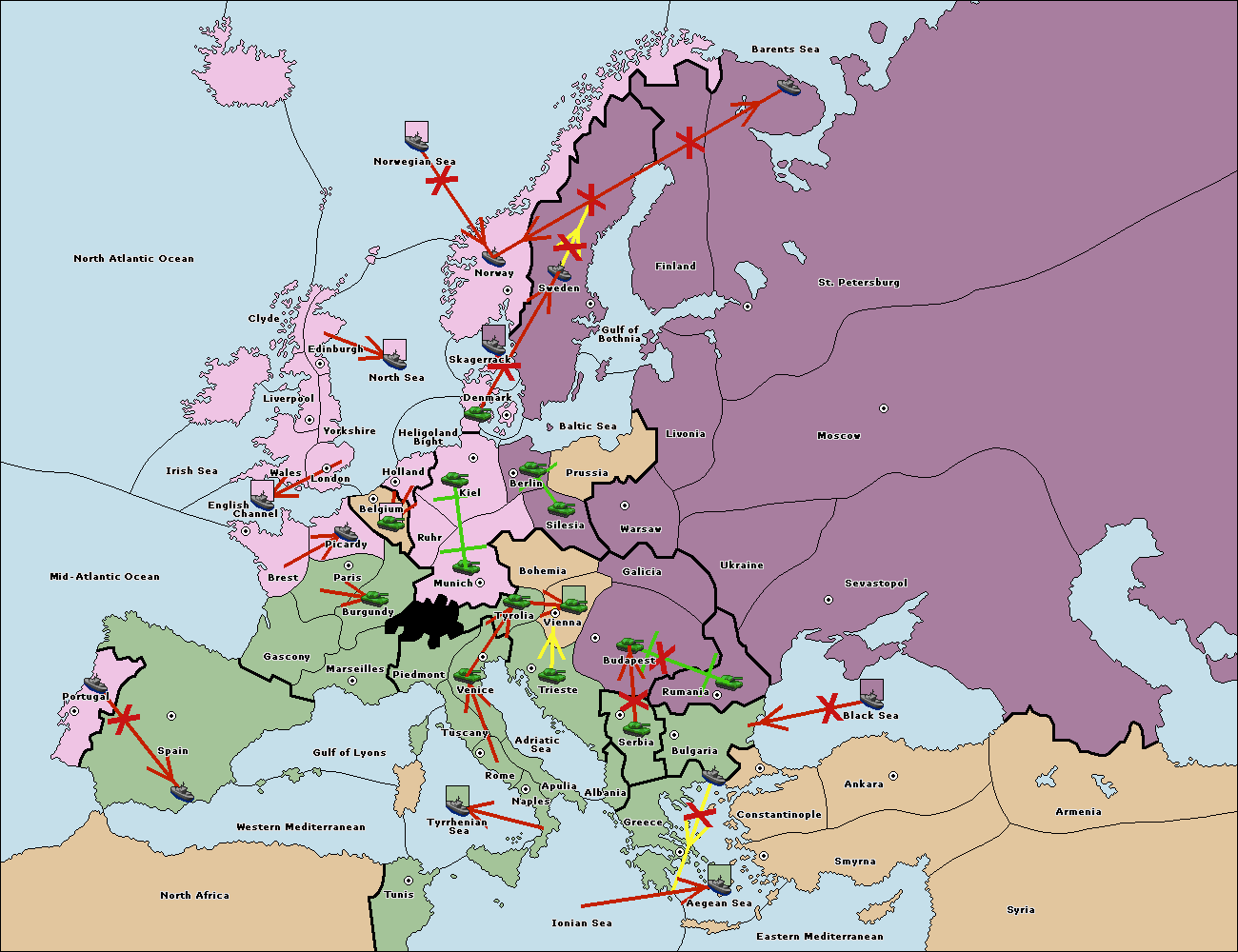 The fleet at Bulgaria (South Coast) support move to Constantinople from Aegean Sea.