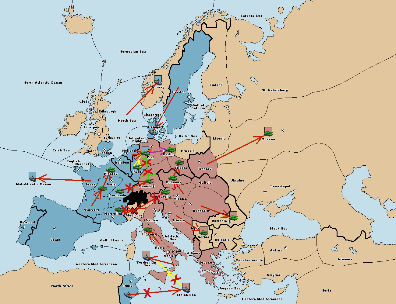 The fleet at Tyrrhenian Sea support move to Tunis from Ionian Sea.