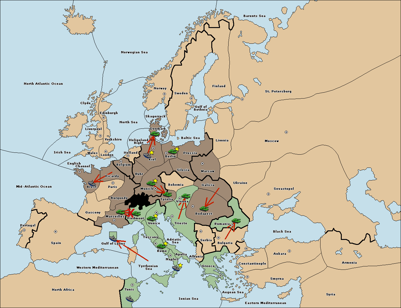 The army at Tyrolia support move to Piedmont from Marseilles.