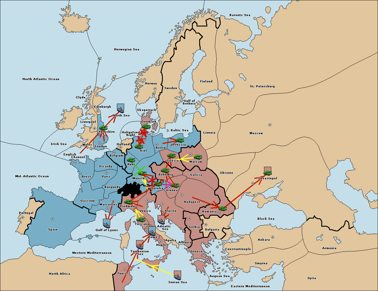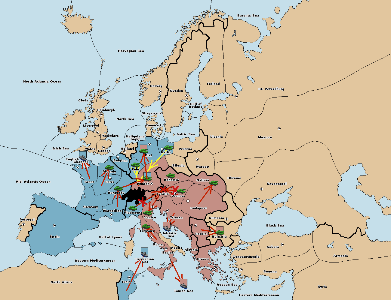The army at Munich support move to Tyrolia from Piedmont.