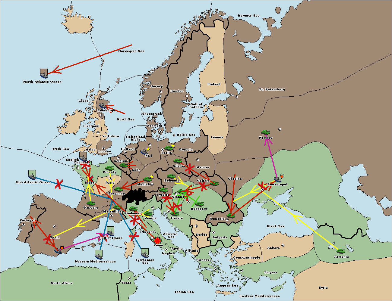 The army at Tyrolia support move to Piedmont from Marseilles.