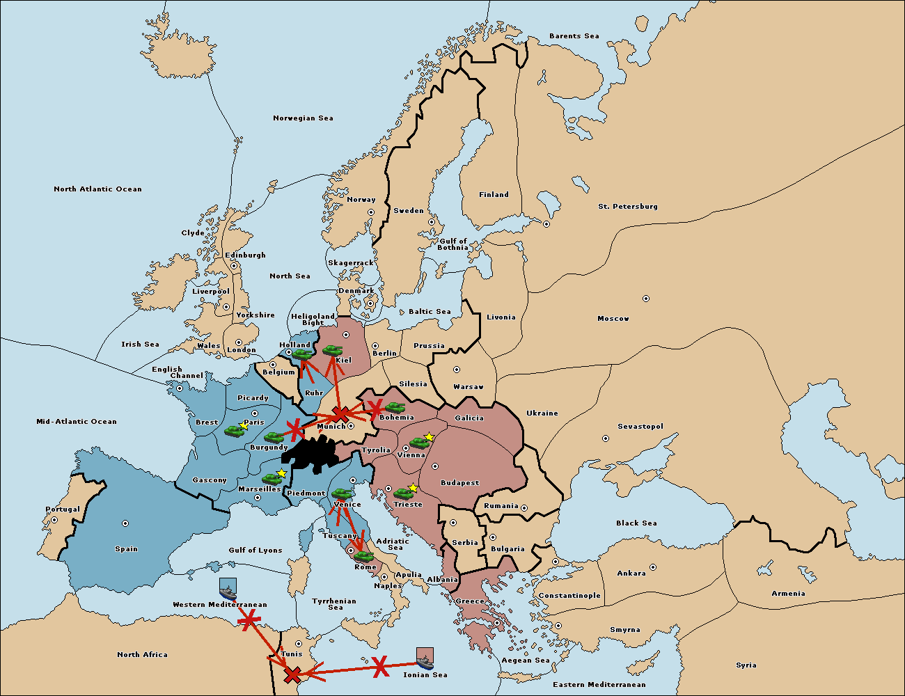 The fleet at Spain (South Coast) support move to Marseilles from Piedmont.