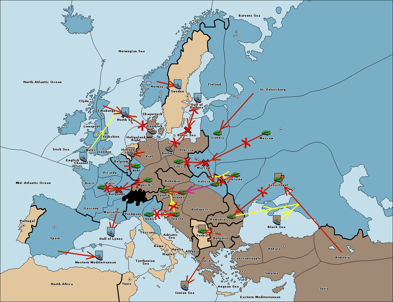 The army at Warsaw support move to Moscow from Sevastopol.