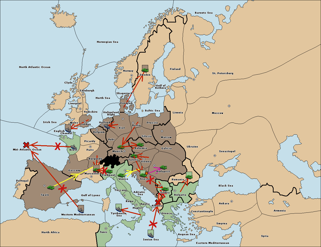 The fleet at Ionian Sea support move to Tyrrhenian Sea from Rome.