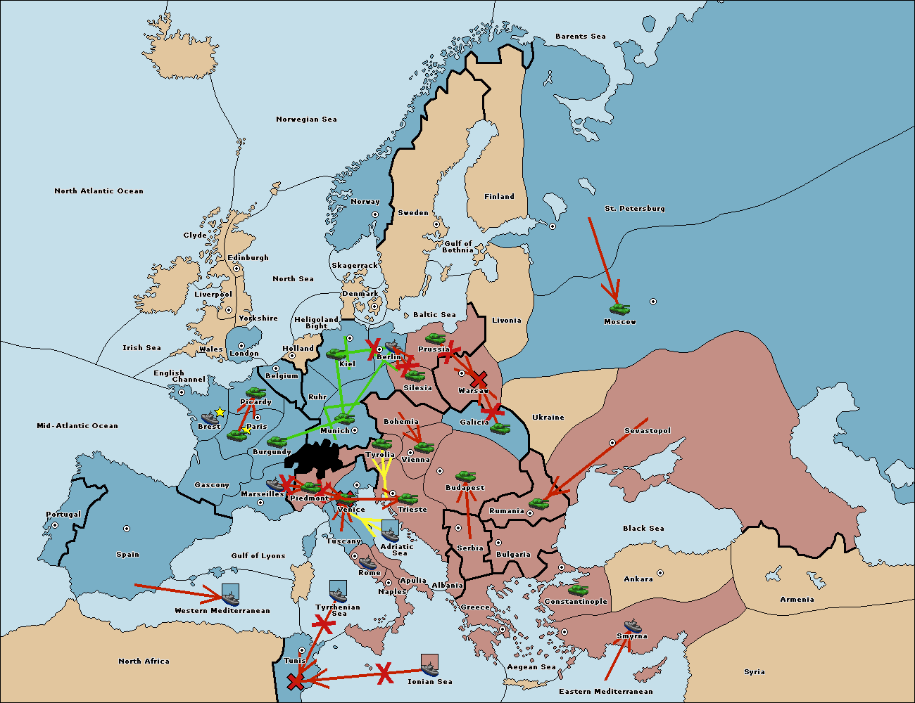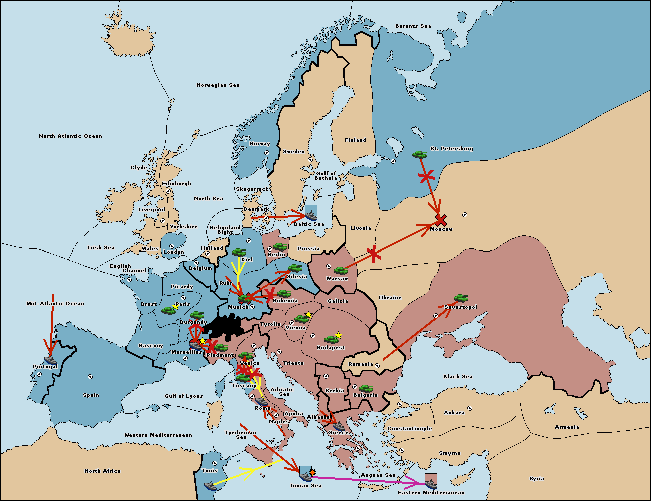 The fleet at Ionian Sea support move to Tyrrhenian Sea from Tunis.