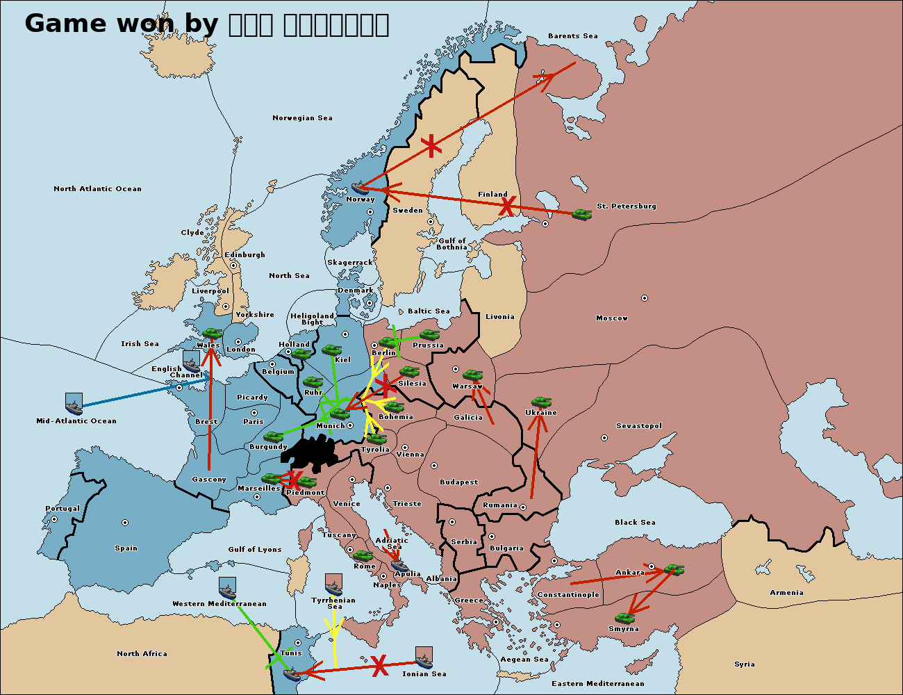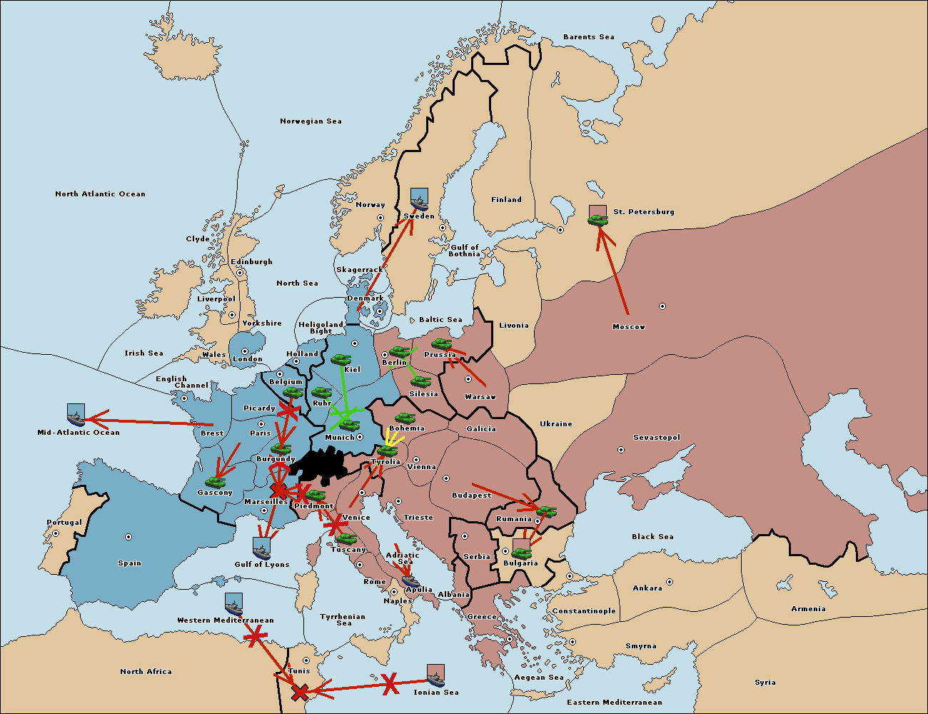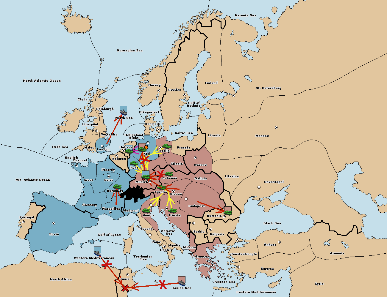 The fleet at Tyrrhenian Sea support move to Tunis from Ionian Sea.