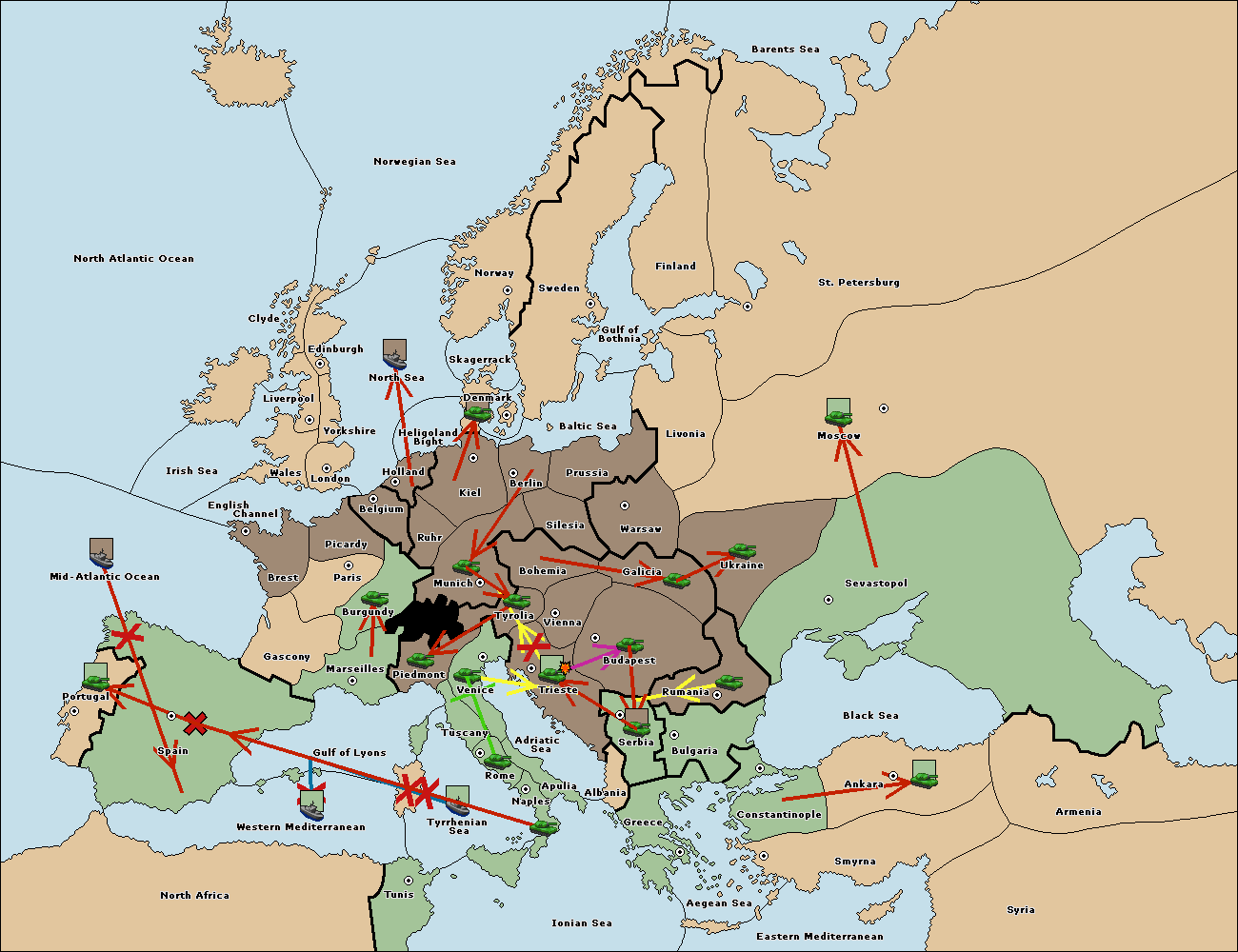 The army at Trieste support move to Tyrolia from Munich.