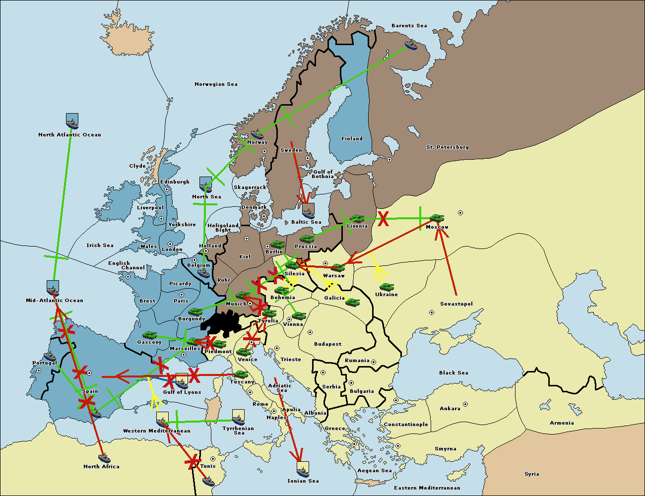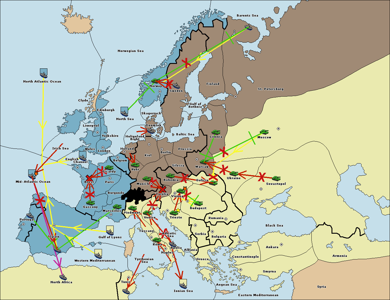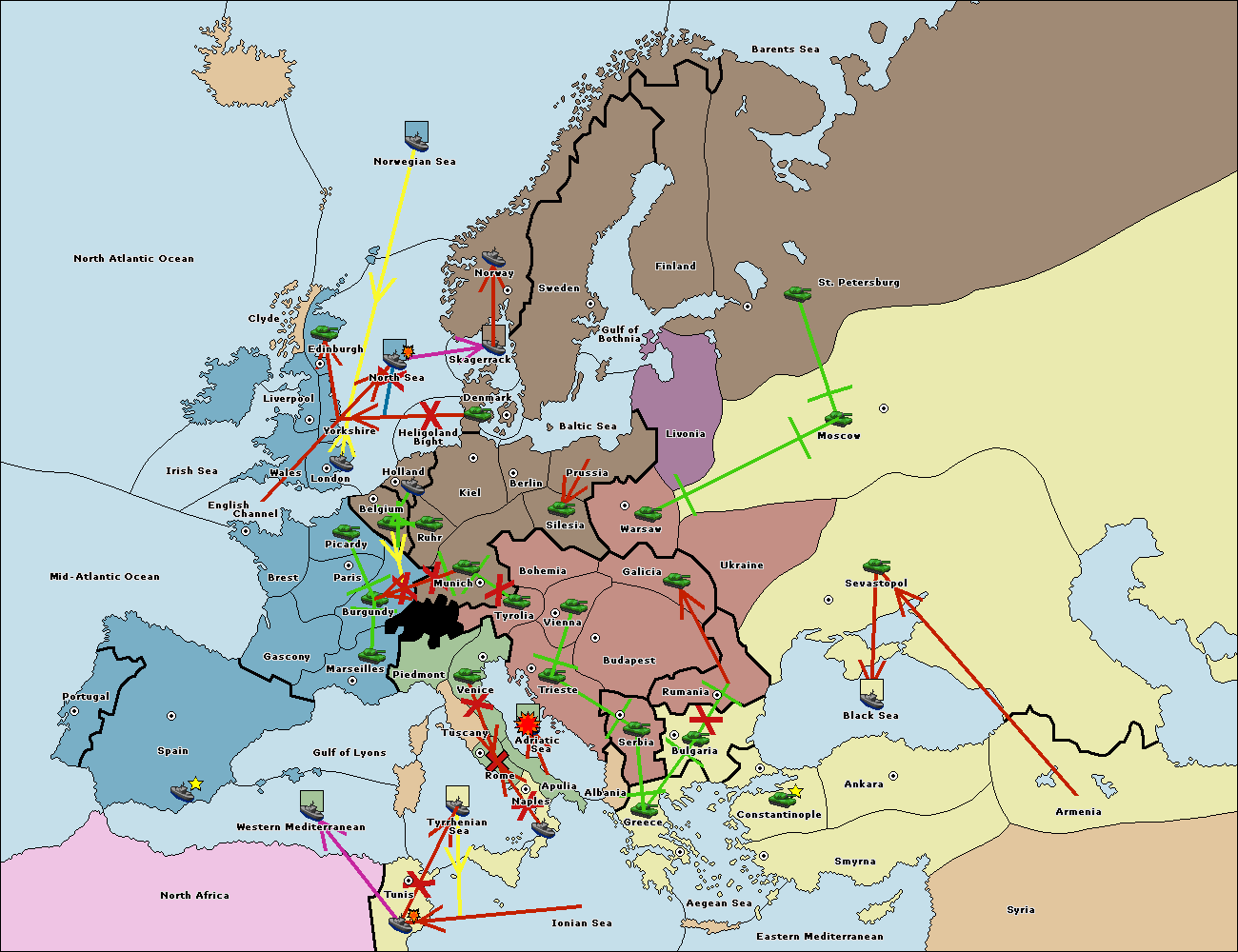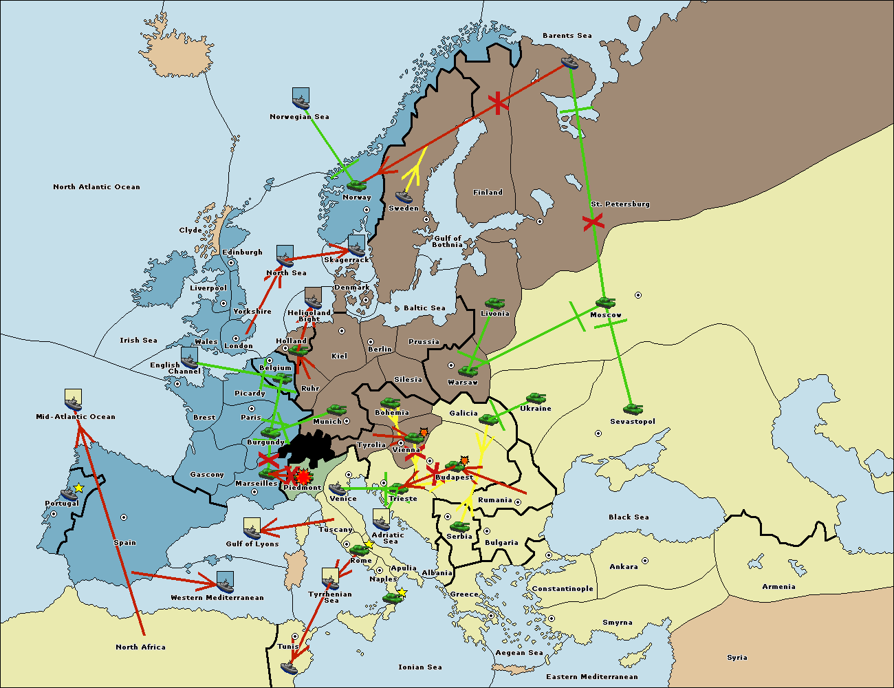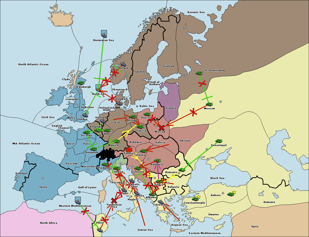 The fleet at Tyrrhenian Sea support move to Tunis from Ionian Sea.