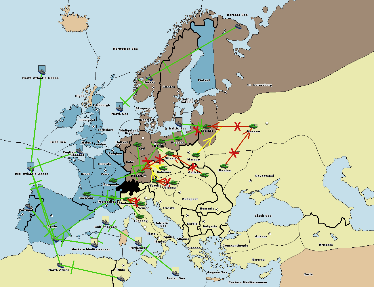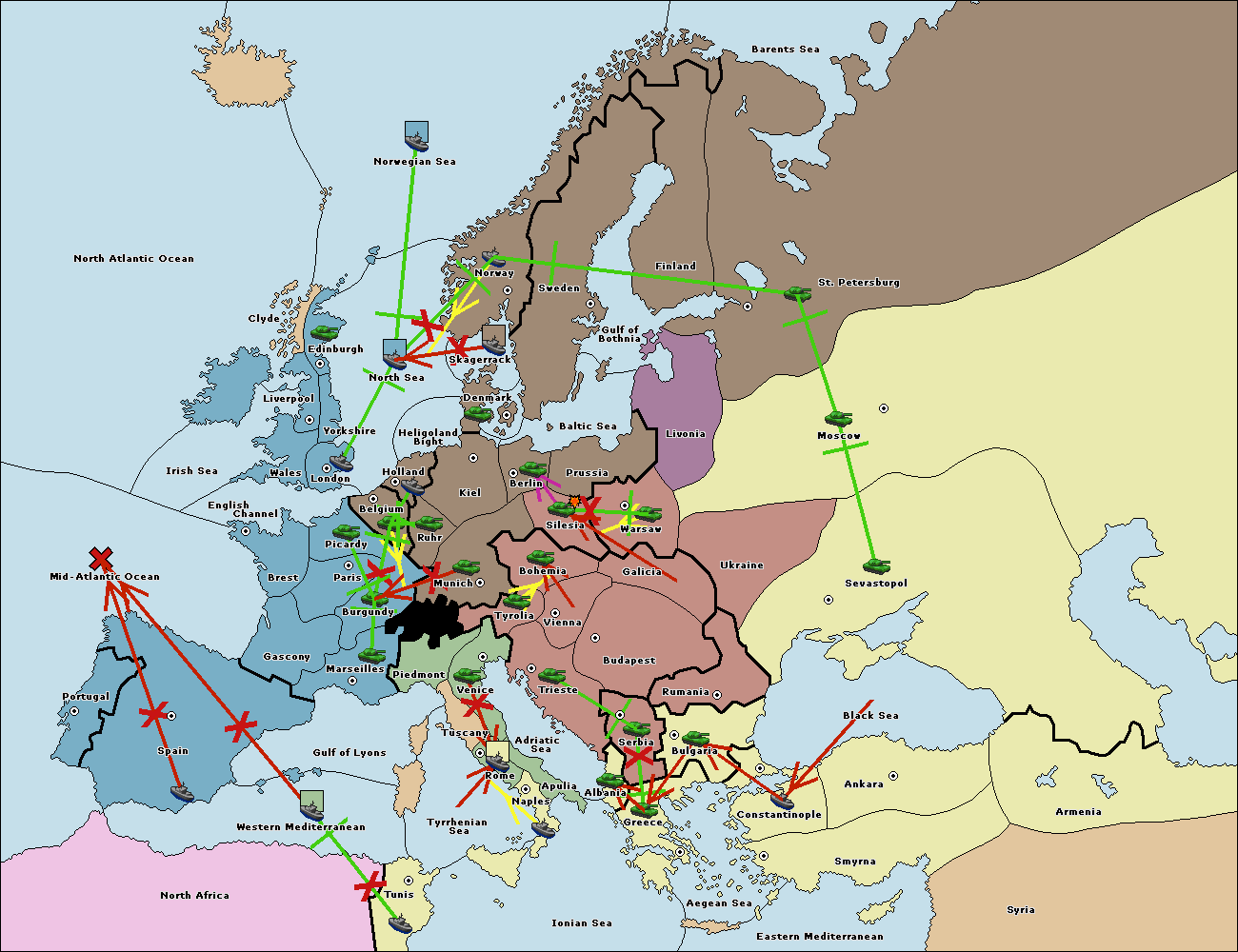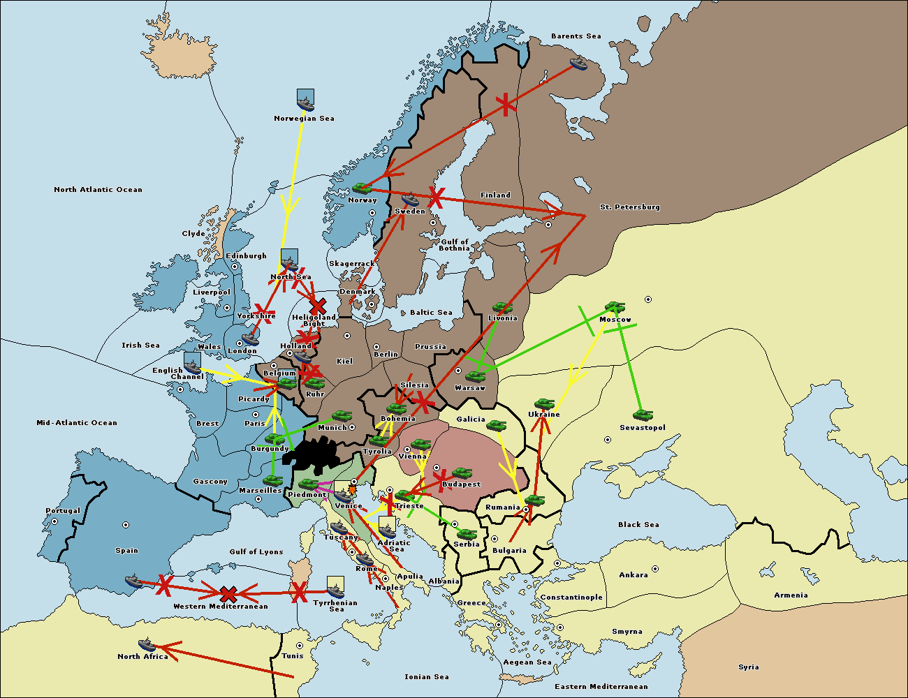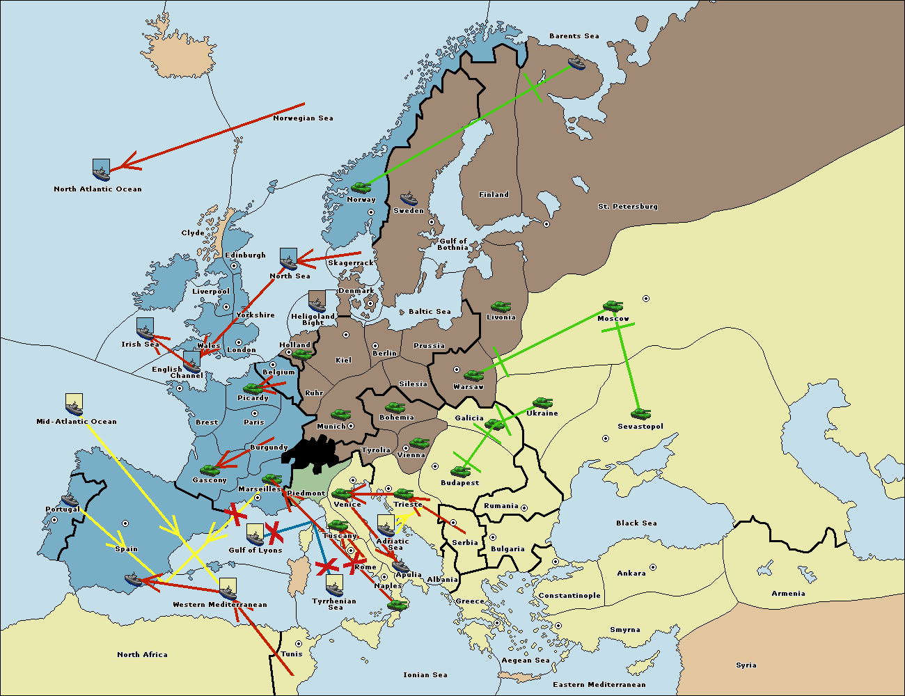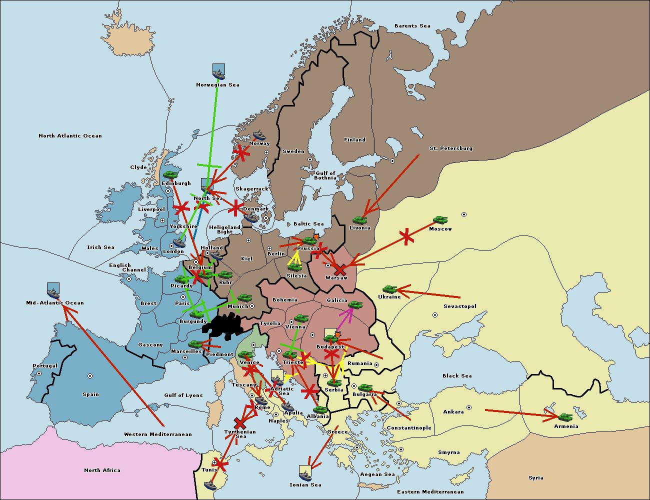 The fleet at Tyrrhenian Sea support move to Tunis from Ionian Sea.