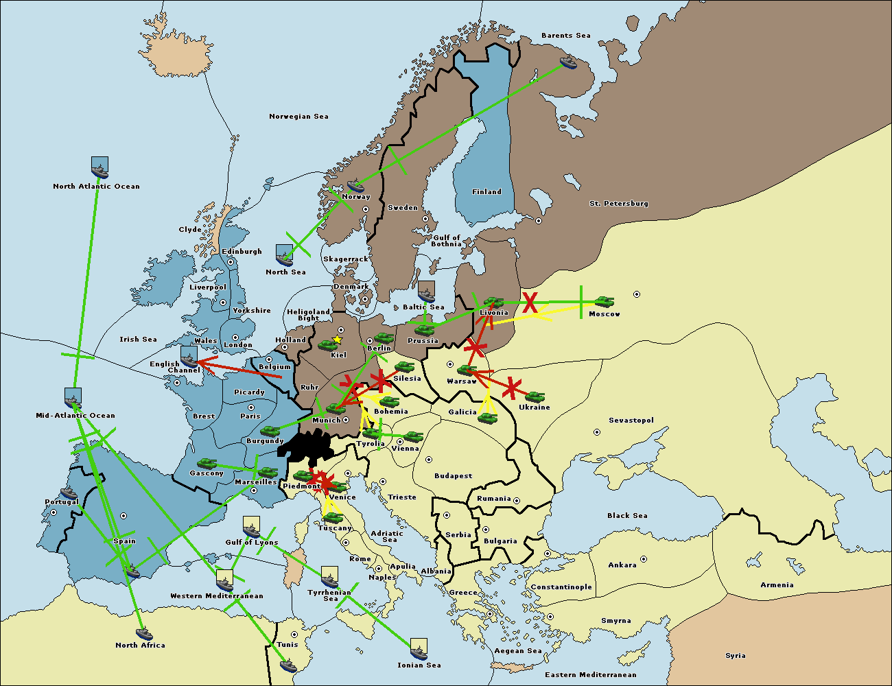 The fleet at Tyrrhenian Sea support hold to Gulf of Lyons.