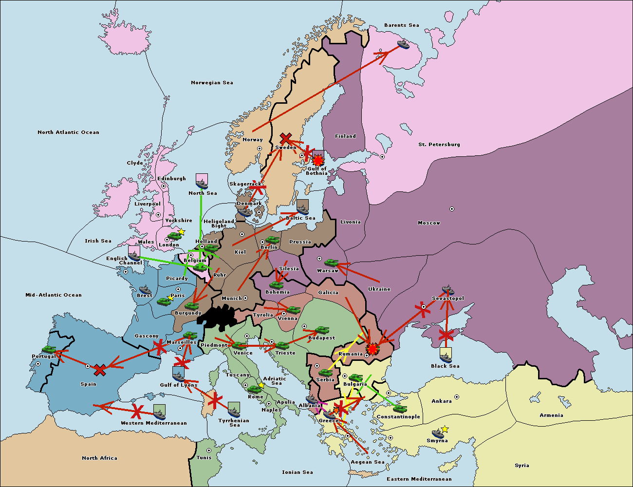 The fleet at Greece support move to Bulgaria from Constantinople.