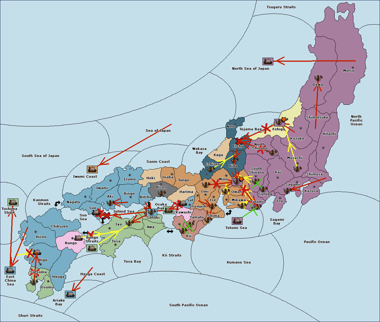 The fleet at Totomi Sea support move to Totomi (9) from Suruga (10).