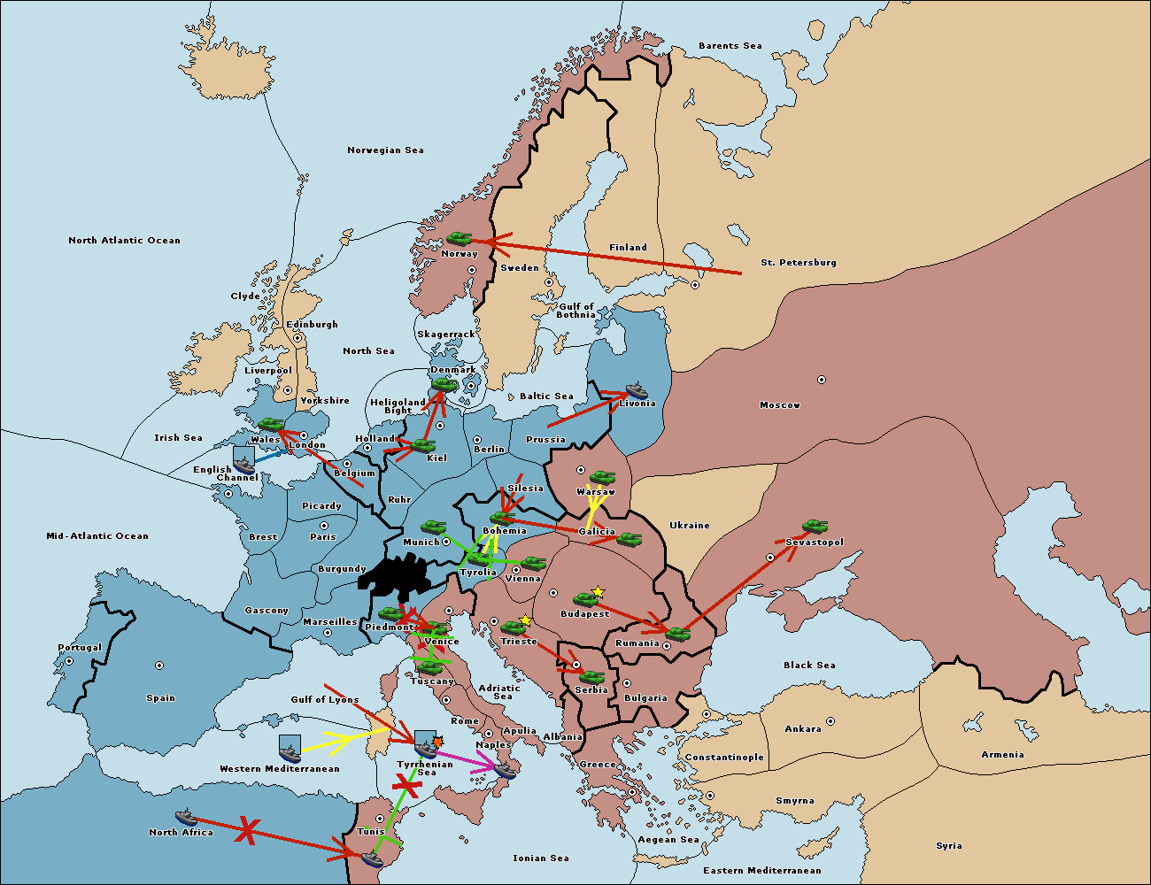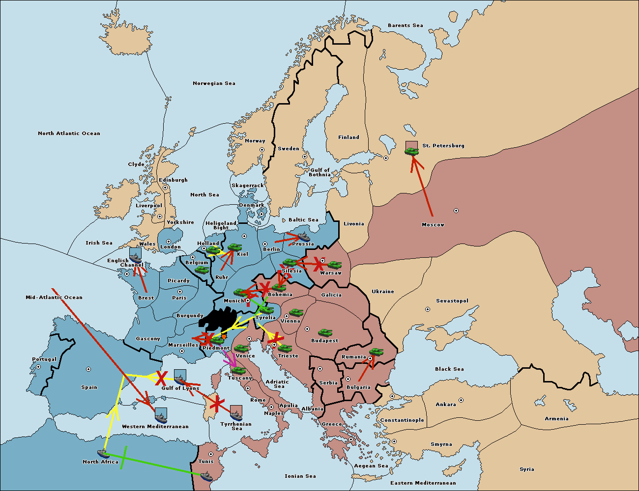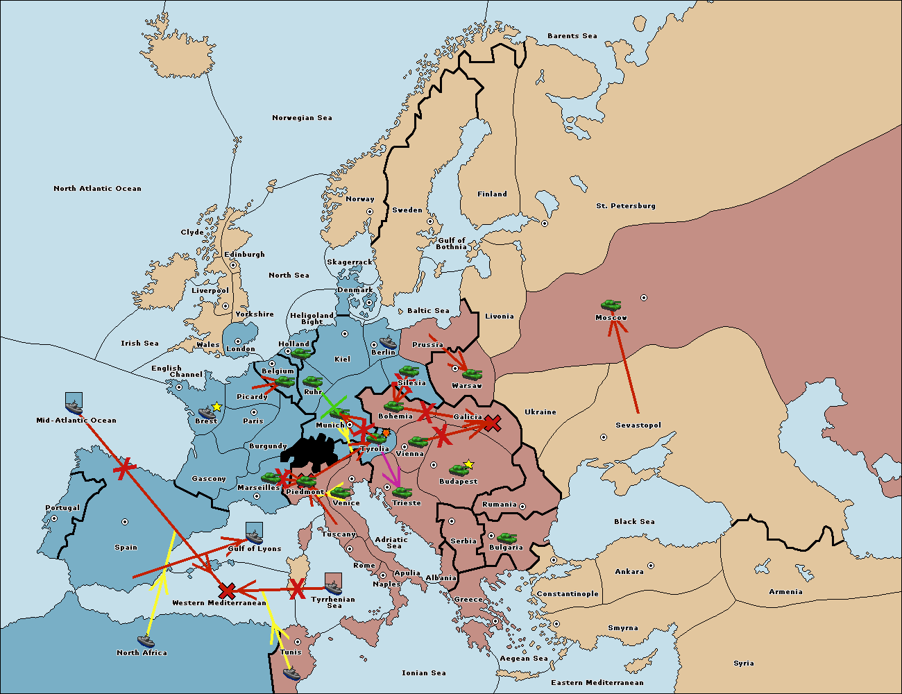 The fleet at Tyrrhenian Sea support move to Tunis from Ionian Sea.