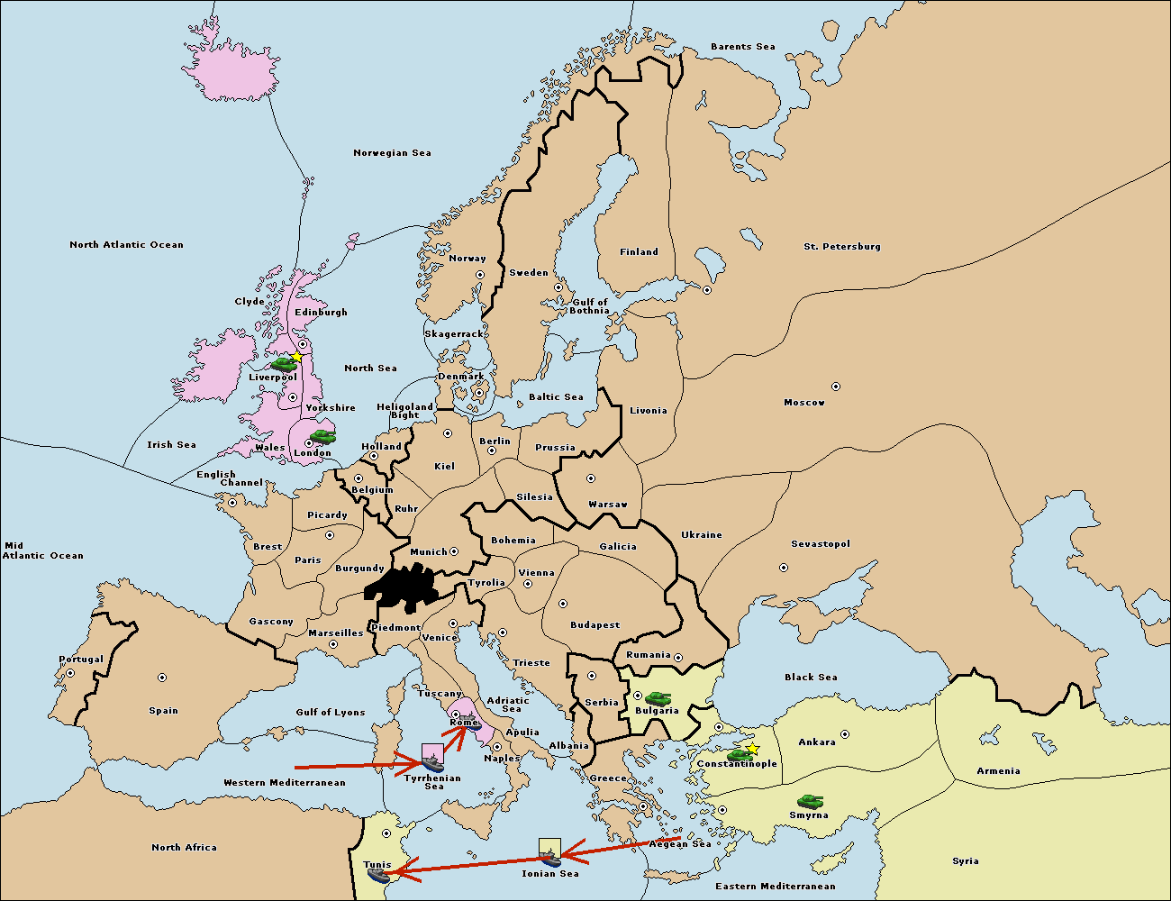 The fleet at Ionian Sea support move to Tyrrhenian Sea from Tunis.