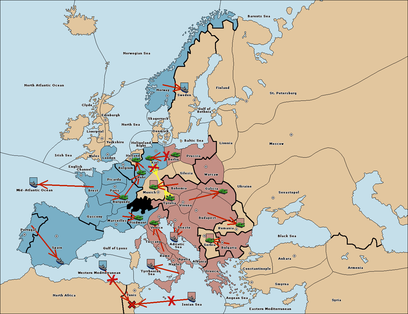 The fleet at Tyrrhenian Sea support move to Tunis from Ionian Sea.