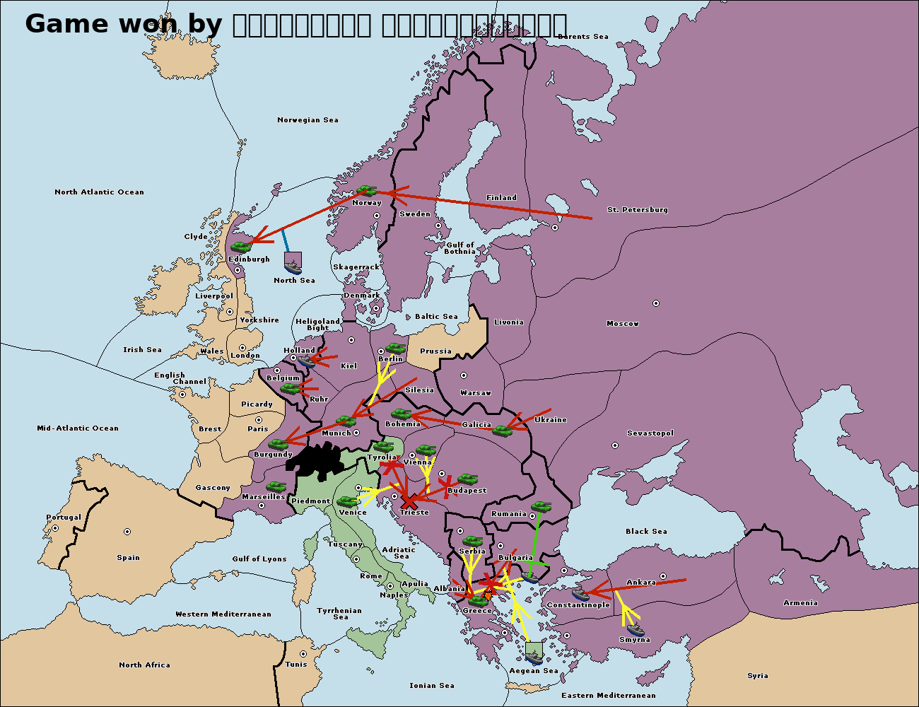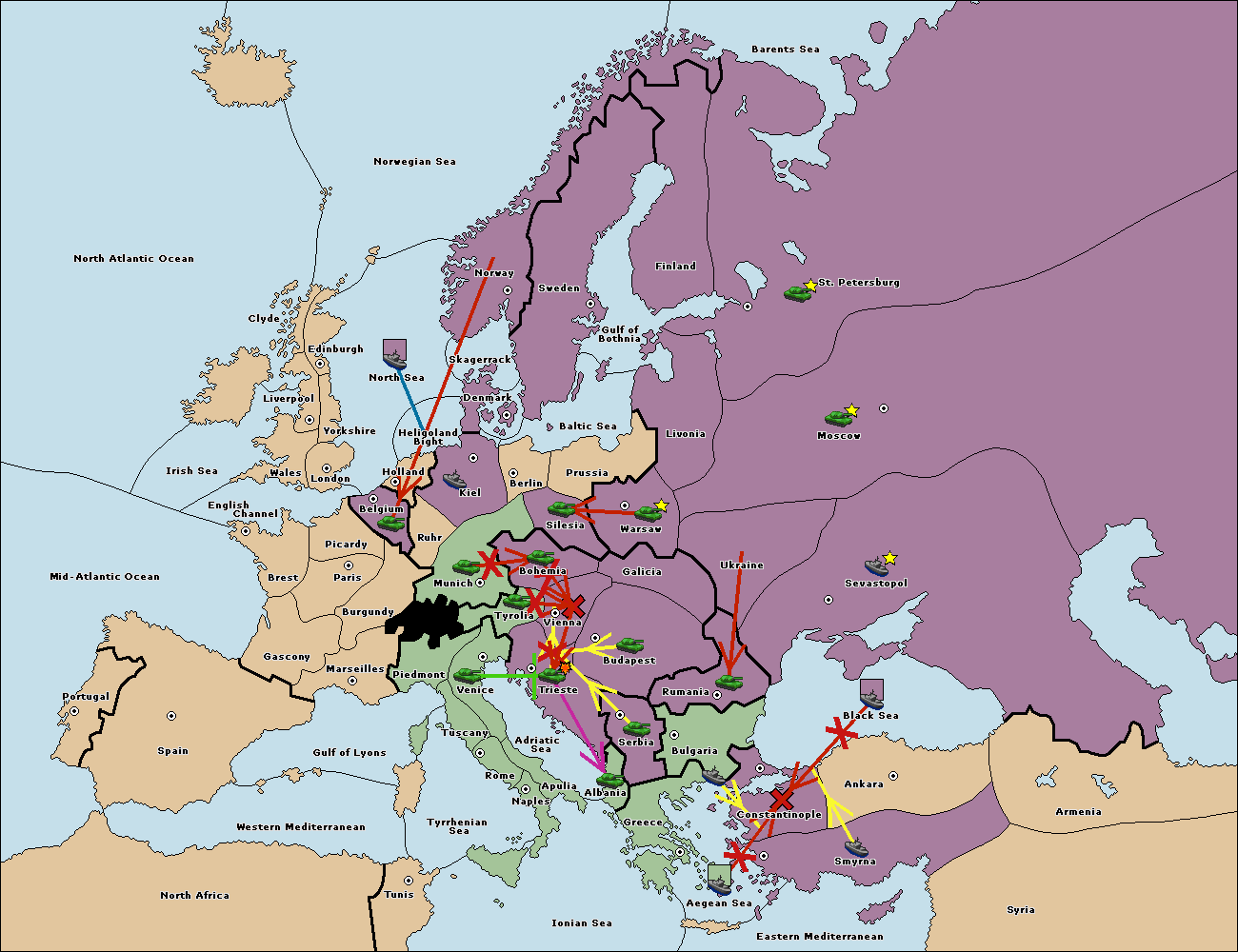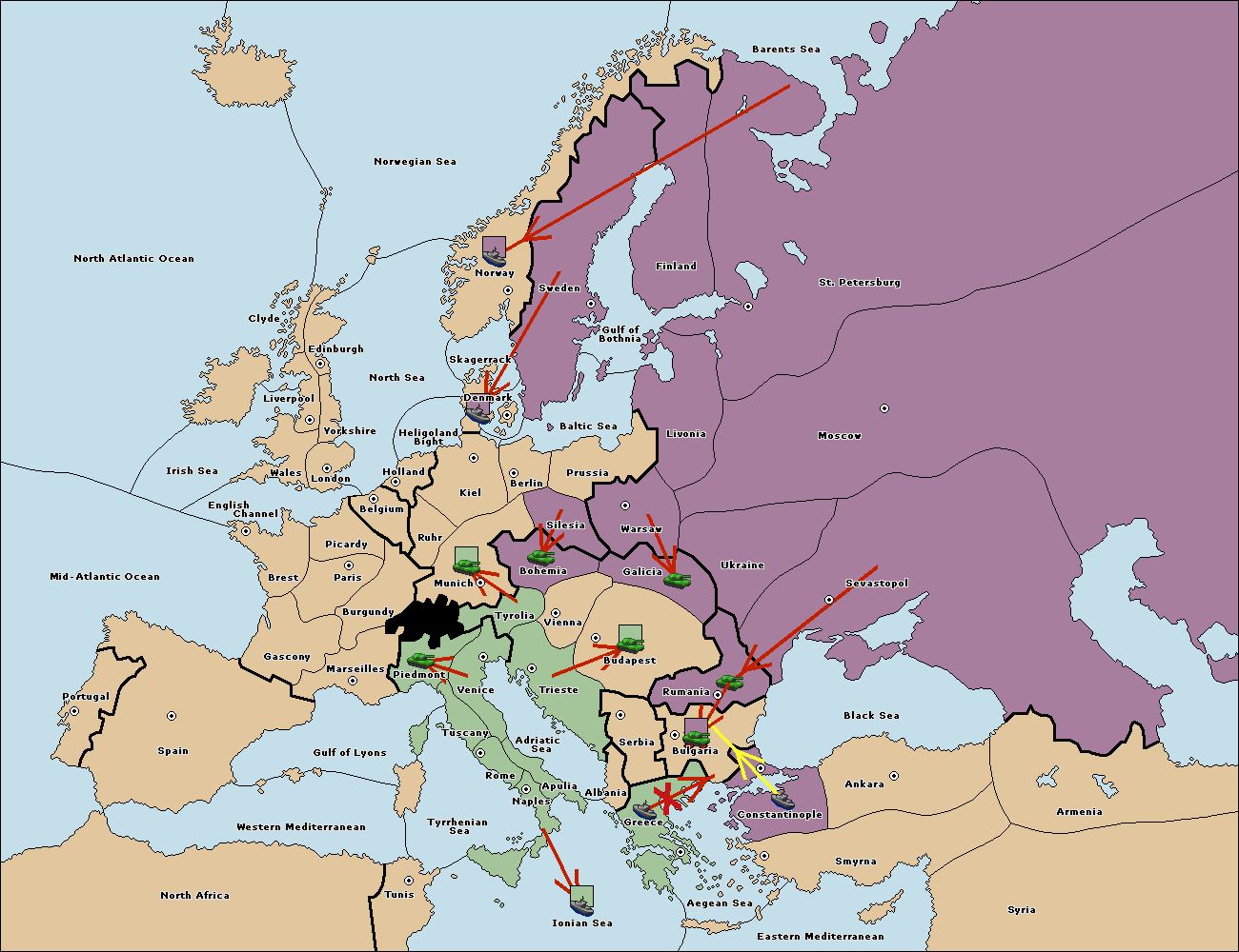 The fleet at Bulgaria (South Coast) support move to Constantinople from Aegean Sea.