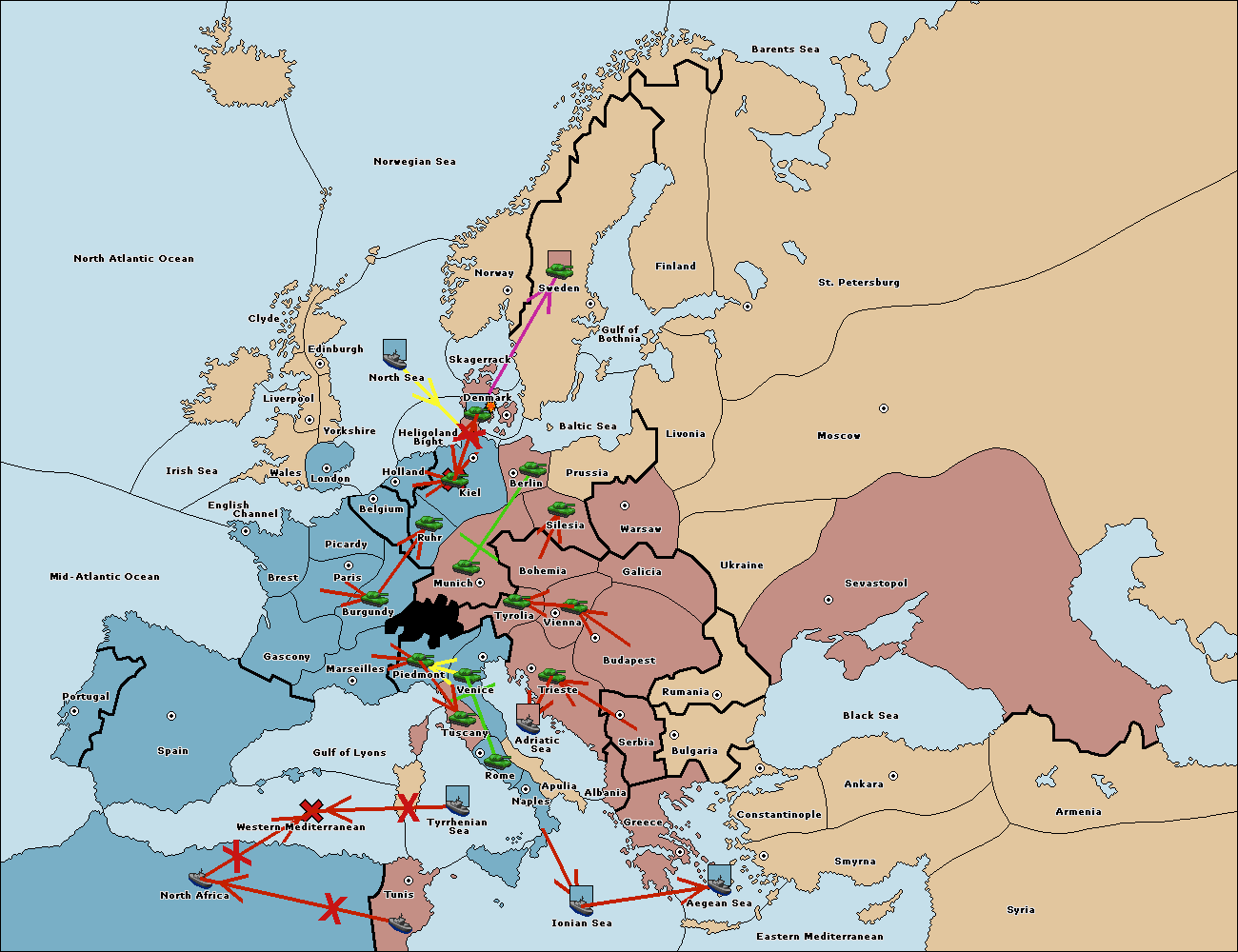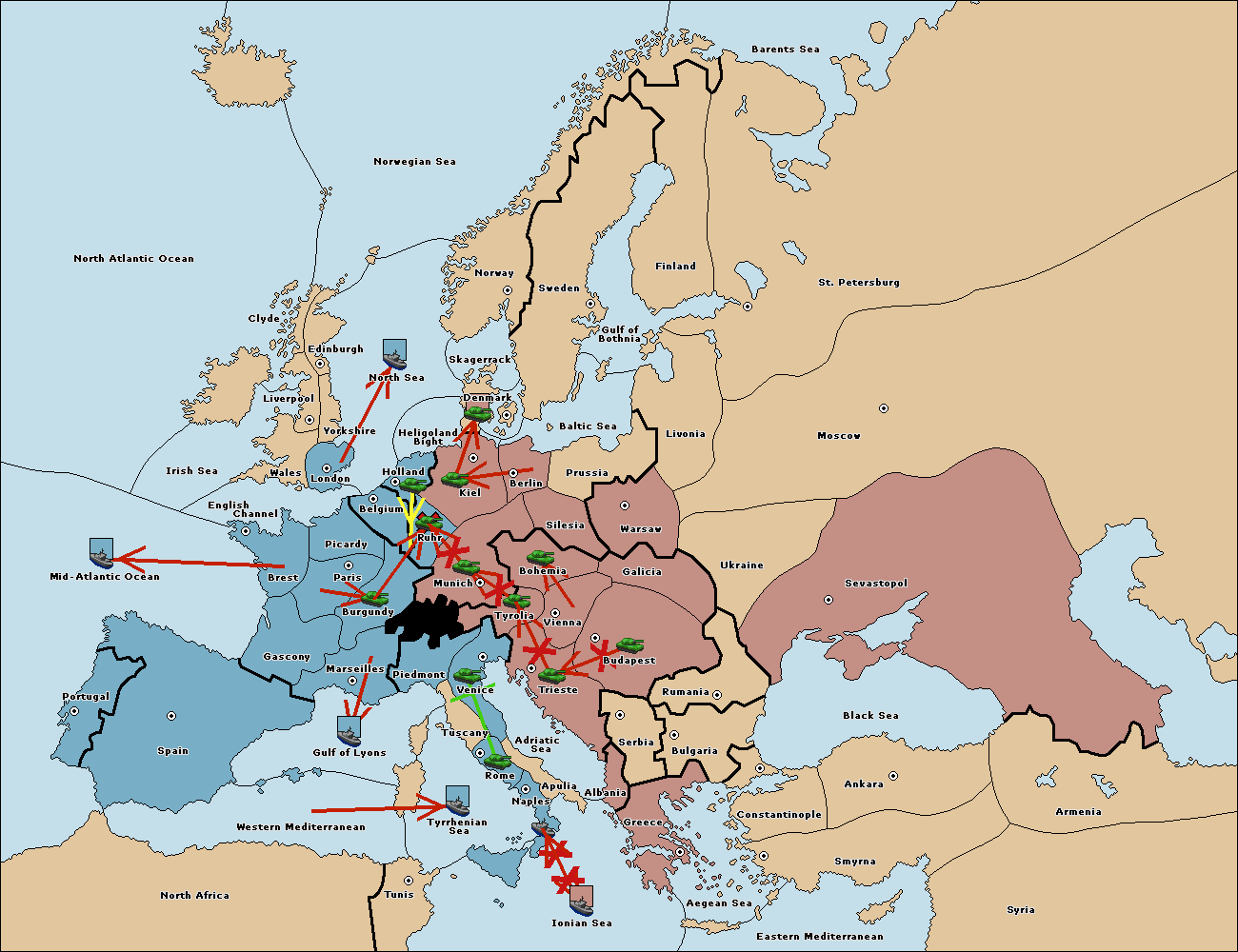 The army at Tyrolia support move to Piedmont from Tuscany.
