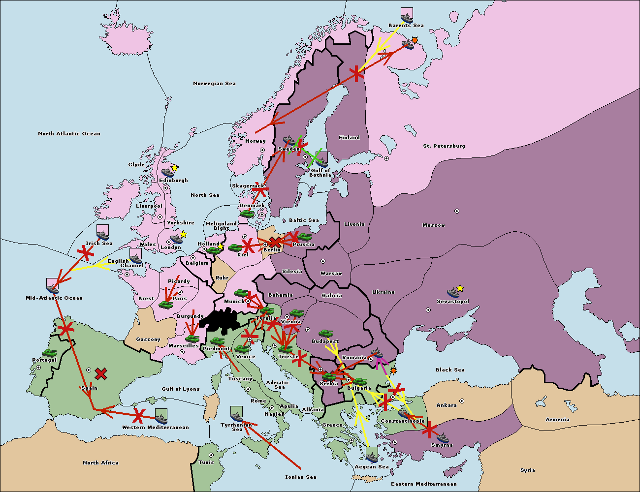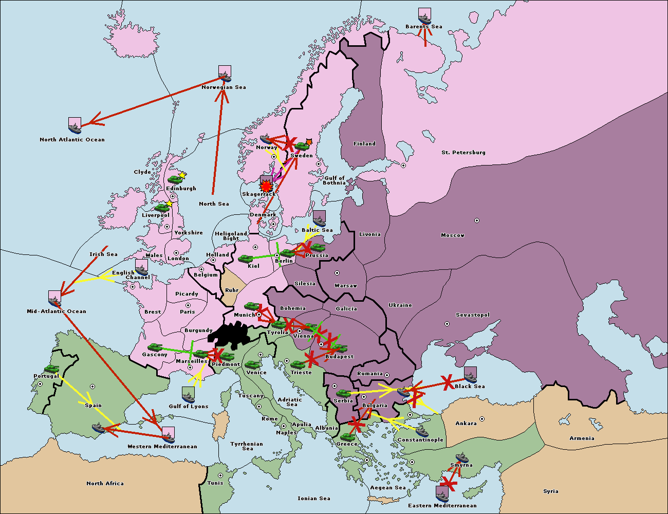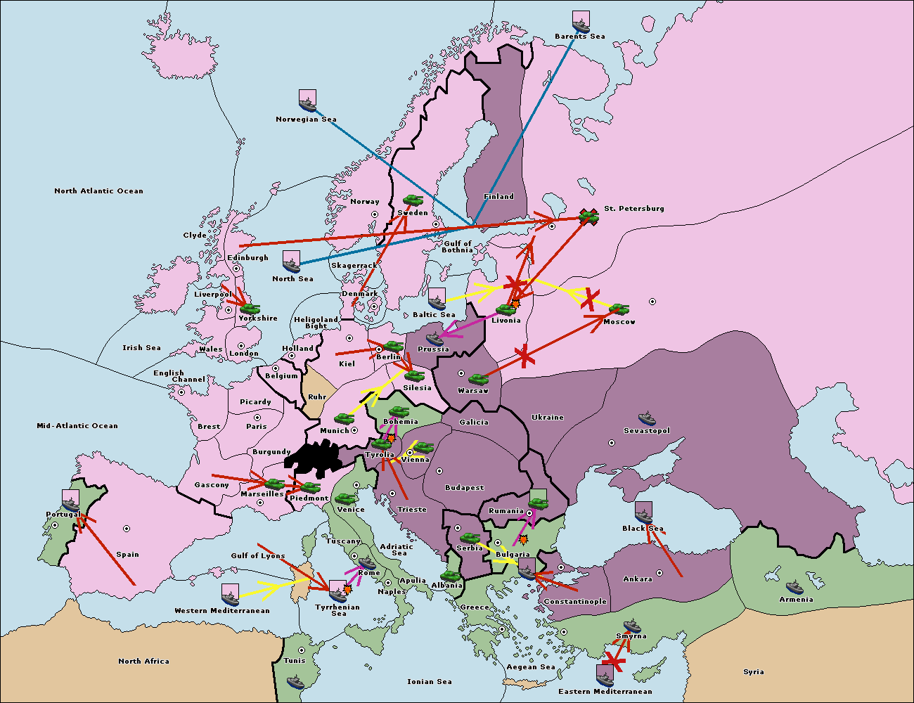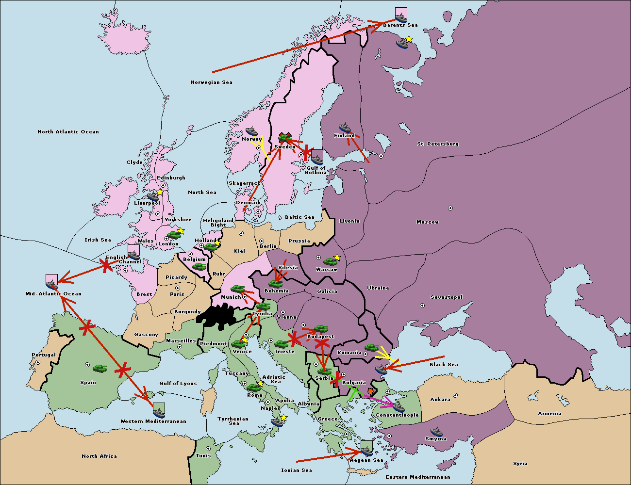 The fleet at Bulgaria (North Coast) support move to Constantinople from Smyrna.