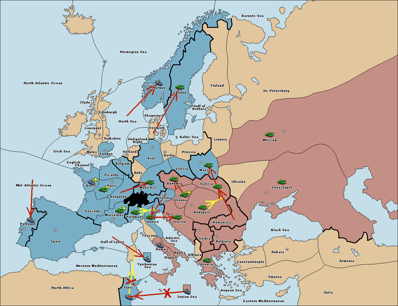 The fleet at Tyrrhenian Sea support move to Gulf of Lyons from Spain.
