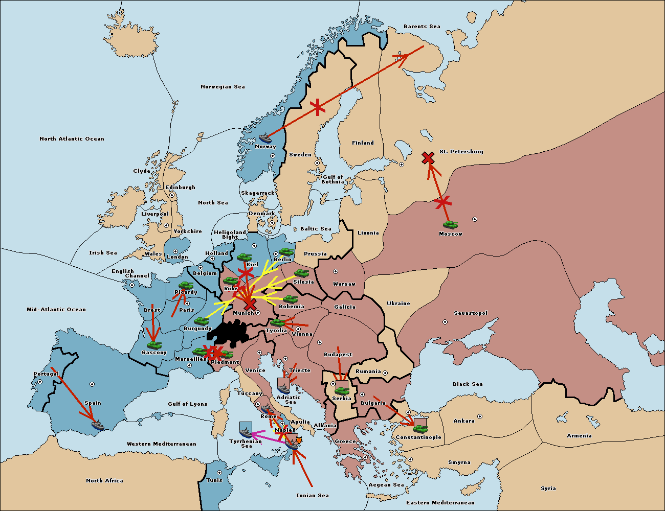 The fleet at Tyrrhenian Sea support move to Tunis from Ionian Sea.