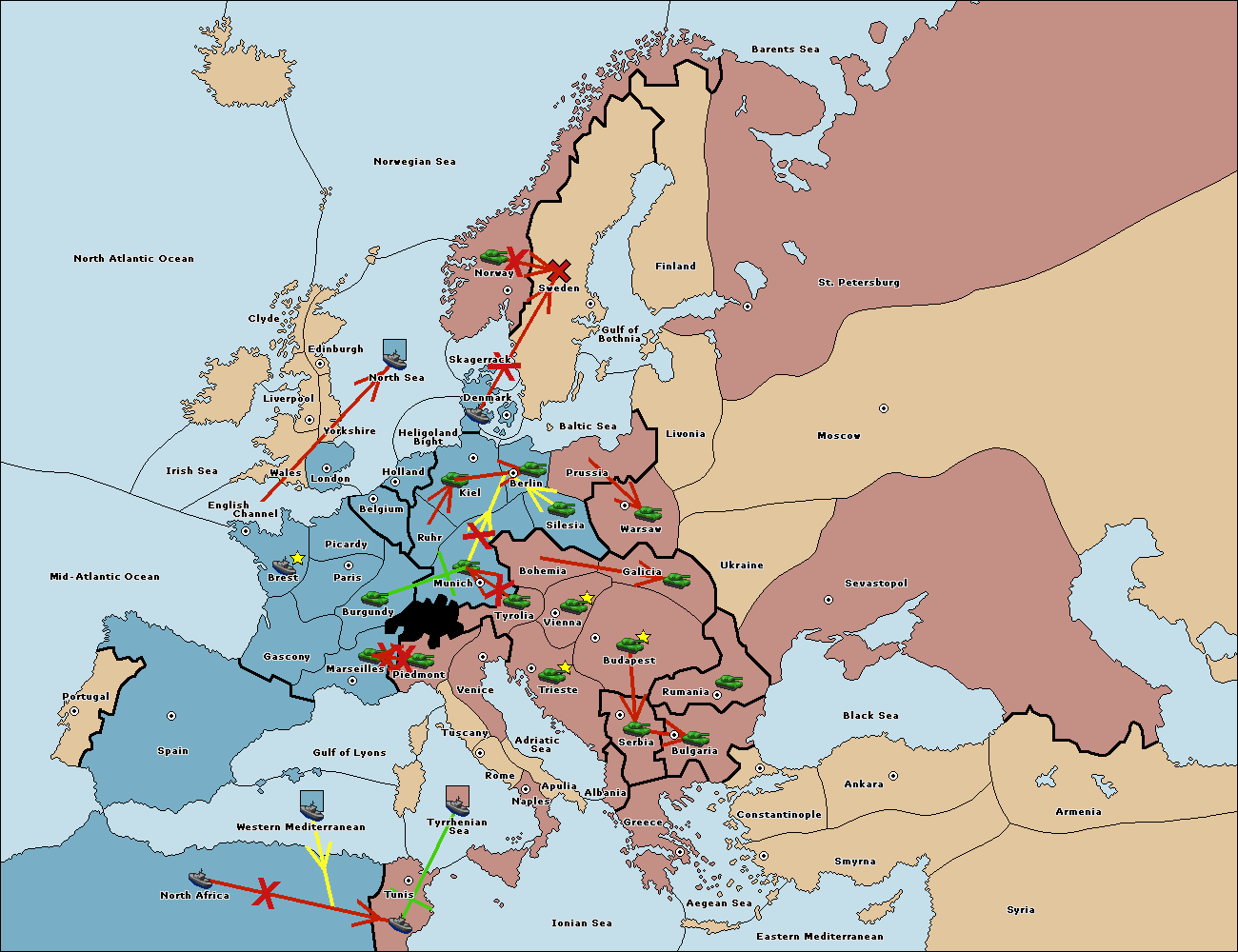 The fleet at Tyrrhenian Sea support move to Tunis from Ionian Sea.