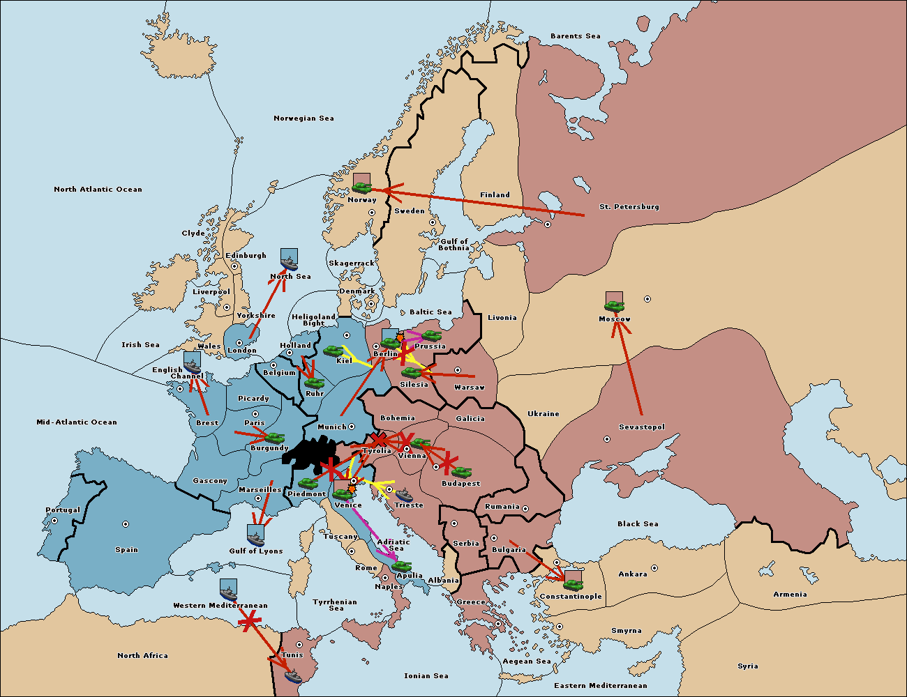 The army at Tyrolia support move to Piedmont from Marseilles.