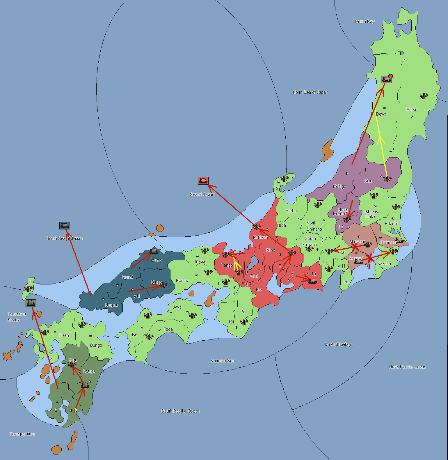 The army at Tango support move to Settsu (4) from Yamashiro (6).
